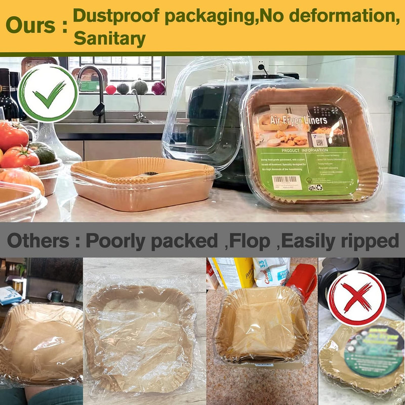 ?Easy to Use?These non-stick air fryer disposable paper liner are designed with a square bowl shape, which do not need to tear, fold, cut, nor bend, and you can directly put it in when you are ready to cook. Its heightened edge 4.5cm can protect the side of fryers and prevent food from sticking to them.