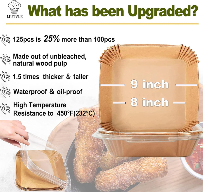 ?Info?Large Size. 125 PCS. Square shape. Wide 9 inch, bottom wide 8 inch, high 1.8 inches, perfects for 5-8 quart air fryer. PLEASE MEASURE YOUR AIR FRYER BASKET BOTTOM BEFORE PURCHASE!