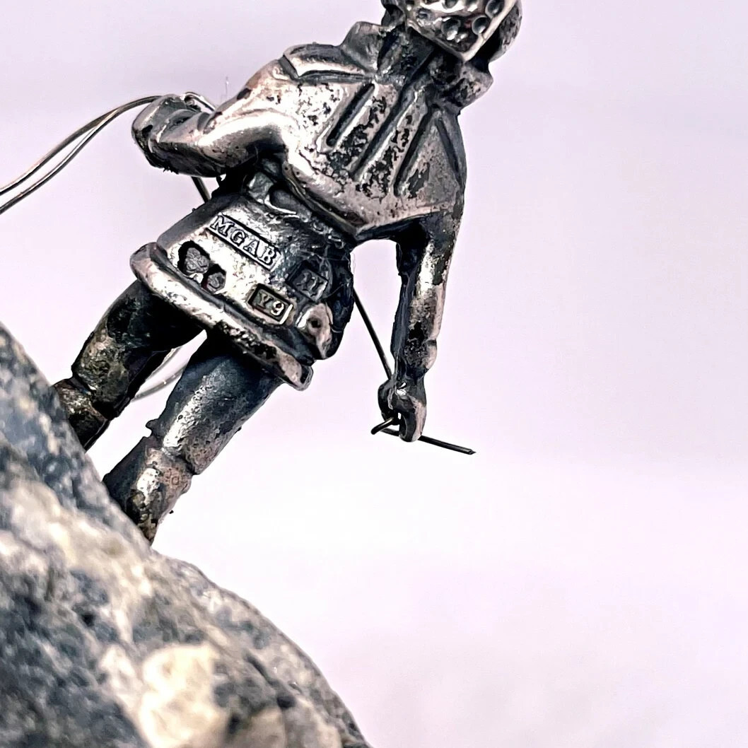 This charming silver object depicts a traditional reindeer herder with rope in hand, standing on a rock perhaps surveying the herd.