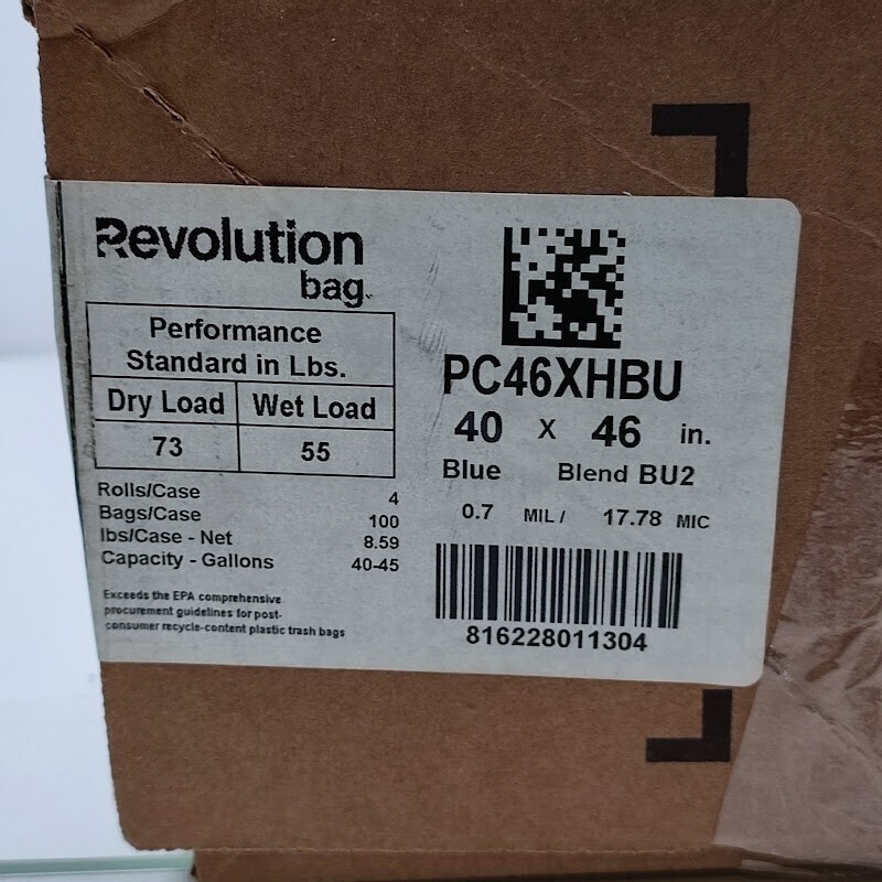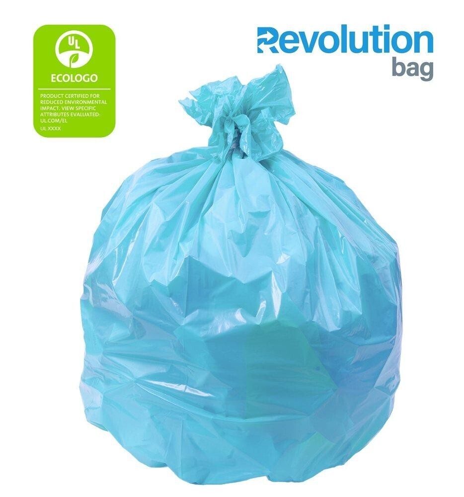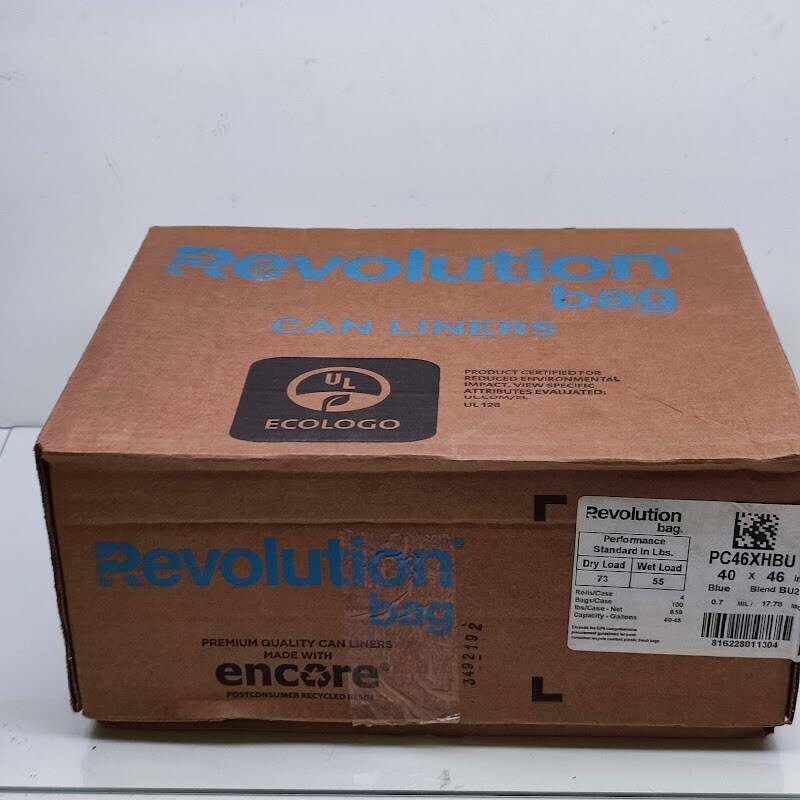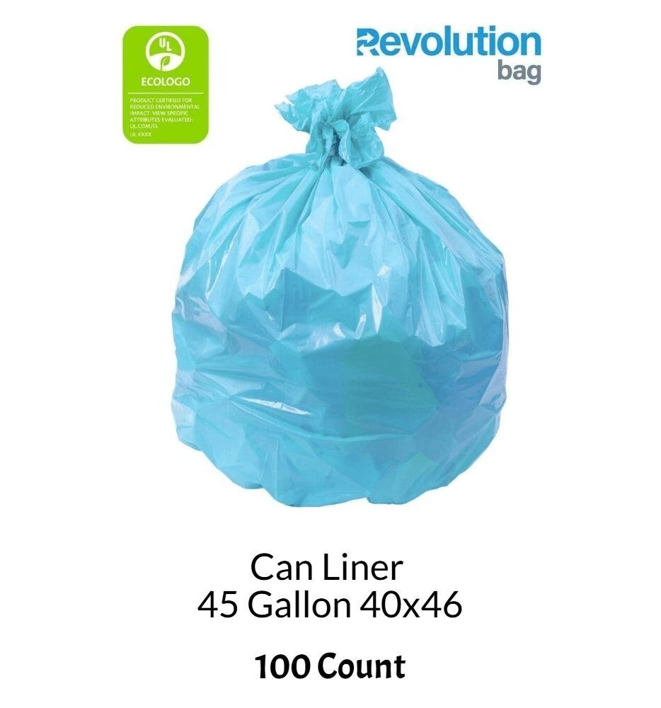 Introducing the Revolution Bag Liner - the eco-friendly solution for your commercial waste management needs. Crafted from durable 0.7mil/17.8mic plastic, these blue can liners are designed to withstand the demands of busy foodservice, office, and cafeteria environments. With dimensions of 40x46 inches, they effortlessly fit 45 gallon containers, ensuring a secure and leak-proof fit. Packaged in convenient cases of 100 liners, this product offers unbeatable value and efficiency for your business. Complement it with Revolution Bag's range of trash cans and accessories for a complete waste management system that prioritizes sustainability without compromising quality.