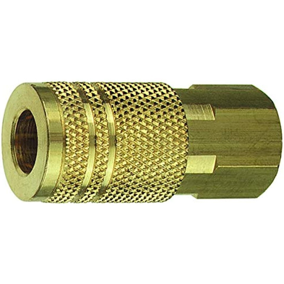 1/4" Industrial Interchange Series Type "D". Brass. Plated steel couplers have hardened steel balls and stainless steel springs. Coupler plugs are heat treated to reduce wear on critical mating surfaces. The Industrial Interchange Series couplers interchange with Aro, Foster, Milton as well as units produced by other manufacturers. Maximum working pressure 300 PSI.