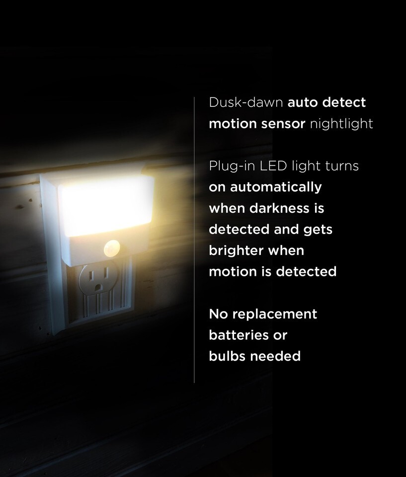 DUSK-DAWN AUTO NIGHTLIGHT the plug-in LED night light turns on automatically when the dusk to dawn auto-sensors detect darkness, providing a soft light when you need it. An energy efficient lighting solution for your home and office