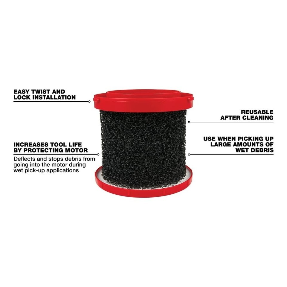 The Milwaukee Foam wet filter is optimized for wet pickup applications. The foam material allows water through but deflects and stops debris from getting into the motor. This protects the motor from debris and increases the tools life. This washable vacuum filter is reusable and compatible with Milwaukee wet/dry vacuums 0880-20, 0960-20, and 0970-20