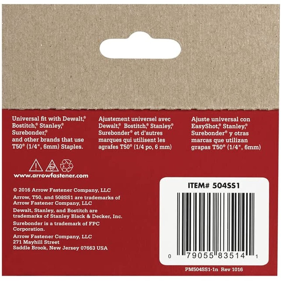 The T50 Genuine Arrow staples are made in the united states from quality stainless steel material, ensuring your stapling is precise, strong and long-lasting first time, every time. Available in 6mm (1/4 inch), 8mm (5/16 inch), 10mm (3/8 inch), 12mm (1/2 inch), 13mm (17/32 inch) and 14mm (9/16 inch) sizes with a flat crown width of 10mm. Also in stainless steel and monel materials.; ; Brand Name: Arrow Style or Series: T50 Crown Width: 3/8 in. Length: 1/4 in. Gauge: 18 Ga. Crown Type: Flat Crown Product Type: Heavy Duty Staples Number in Package: 1000 pk Color: Gray Packaging Type: Boxed Material: Stainless Steel Not for marine application