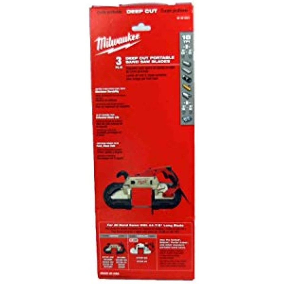 Maximize your band saw performance and make straight, accurate cuts in a variety of materials with the Milwaukee 18 TPI Standard / Deep-Cut Portable Band Saw Blade (3-Pack). Get exceptional durability and accuracy for your portable band saw that takes a 44-7/8" blade. Milwaukee's standard/deep cut band saw blades deliver long tooth life in a variety of metal, including strut, conduit, angle iron, copper tube, threaded rod and pipe. The blade's tooth form, pitch and set ensure straight, accurate cuts time and time again.