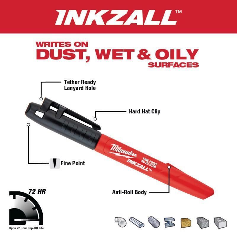 INKZALL? Jobsite Markers feature clog resistant tips and the ability to write through dusty, wet or oily surfaces. The durable marker tips are designed for writing on rough surfaces such as OSB, cinder block and concrete and the ink dries quickly to reduce smearing markings, without drying out quickly when the cap is left off. For added user convenience, the INKZALL? markers have a built-in hard hat clip for easy storage and access. INKZALL? markers confirm to Milwaukee?s commitment to best-in-class durability and their relentless mission to provide innovative solutions to the end user.