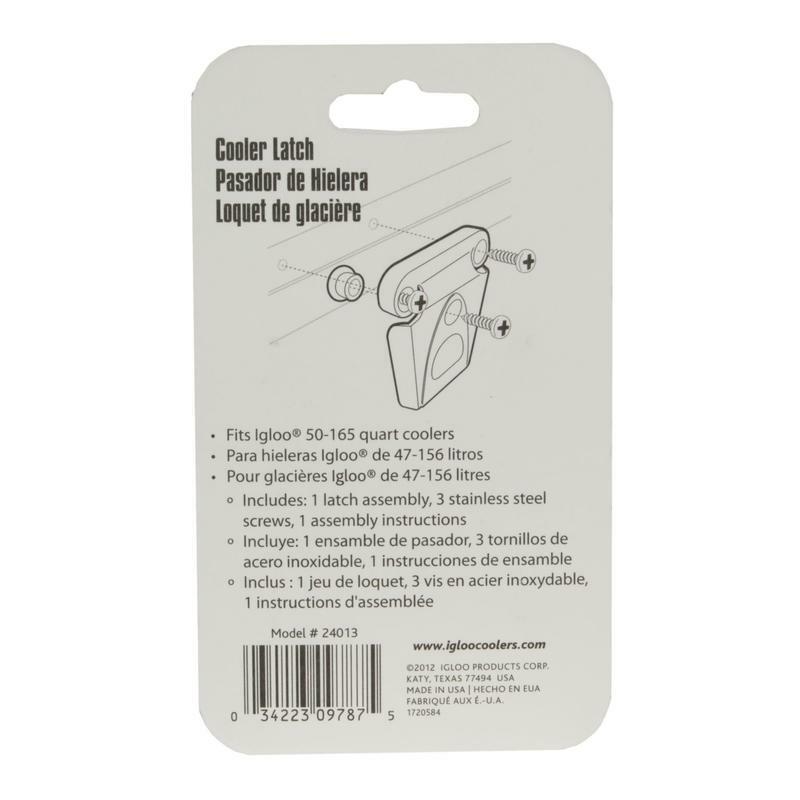 Single unit includes: 1 Latch, 1 Post, 3 Screws, Instructions. Universal latch fits all Igloo coolers with latch closures 50-165qt. Rugged and durable for long cooler life. Rests close to cooler when unlatched to minimize shearing off. Beveled latch edge deflects impact, reducing chance of breakage. Interchangeable/retrofits with all current and original style Igloo latches.