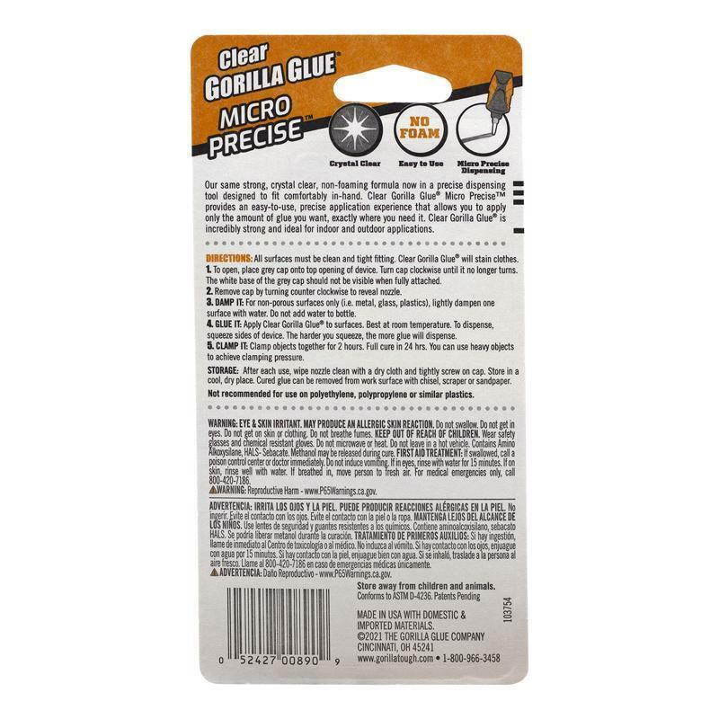 Our same strong, crystal clear, non-foaming formula now in a precise dispensing tool designed to fit comfortably in-hand. Clear Gorilla Glue Micro Precise provides an easy-to-use, precise application experience that allows you to apply only the amount of glue you want, exactly where you need it. Clear Gorilla Glue is incredibly strong and ideal for indoor and outdoor applications.