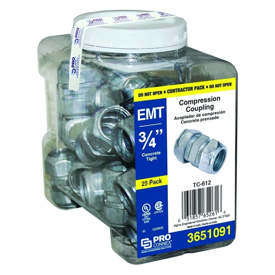 Sigma's EMT Compression Couplings are used to connect two lengths of steel EMT conduit in dry locations. These die-cast zinc couplings are approved for concrete-tight applications.