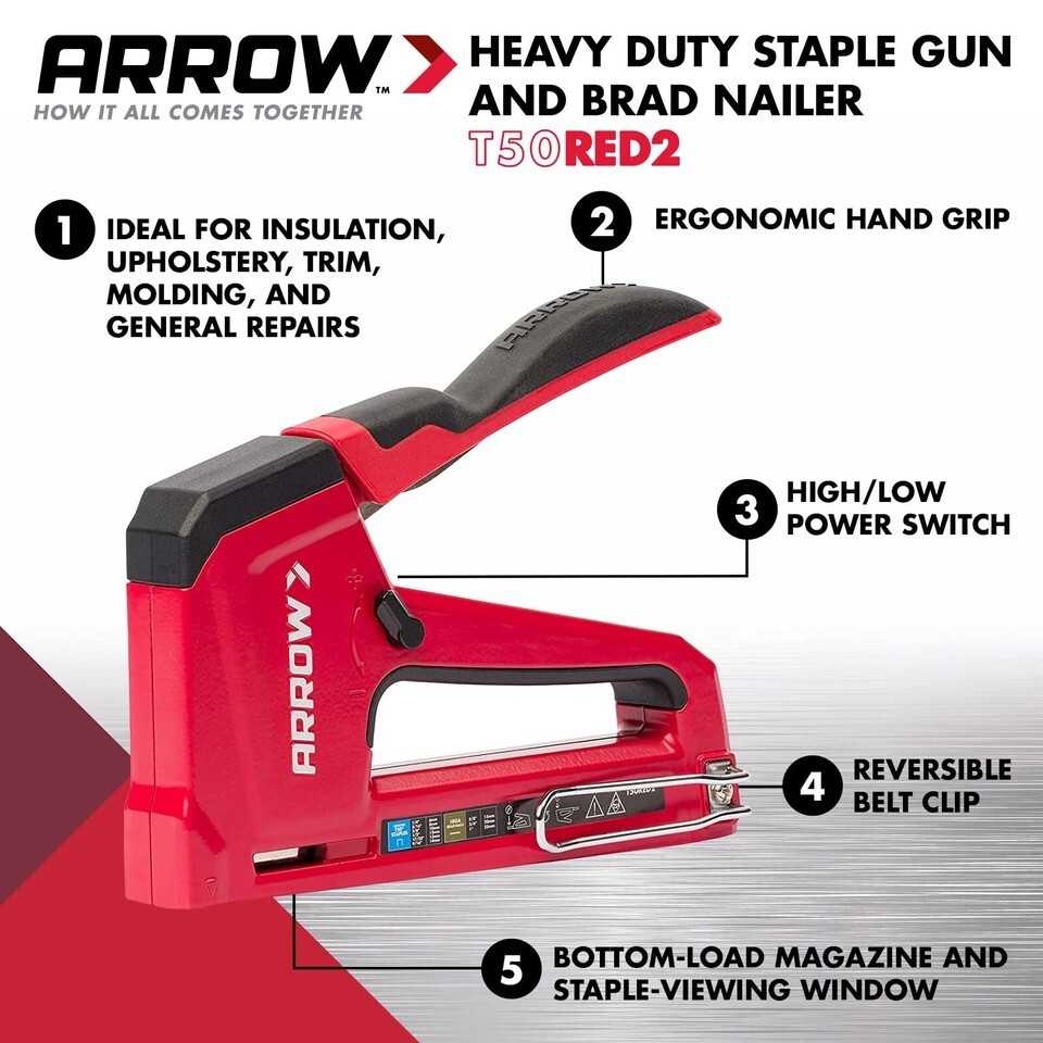READY FOR ACTION: The Arrow T50RED2 combination stapler and nailer is great for professional or household projects like installing insulation, upholstery, general repairs, and insulation; It belongs in the toolbox of any serious craftsman or DIY-er