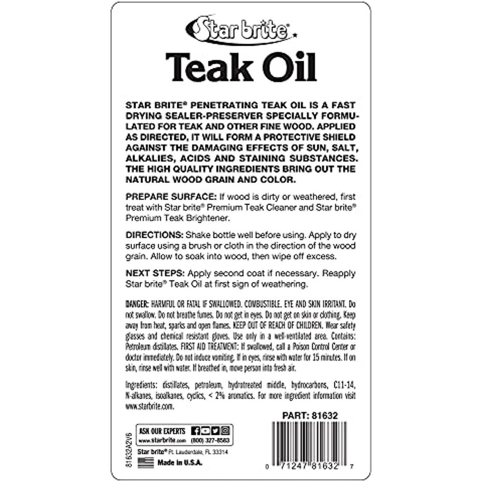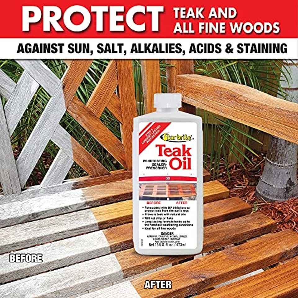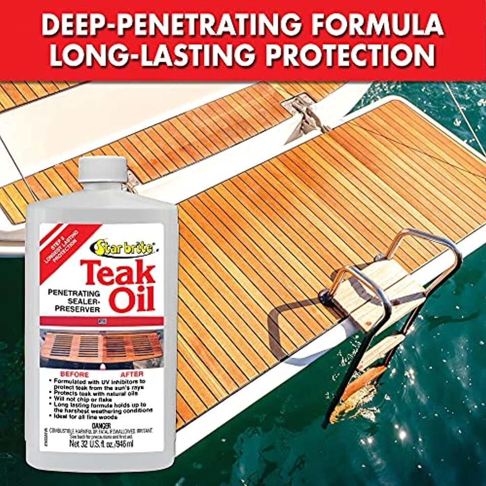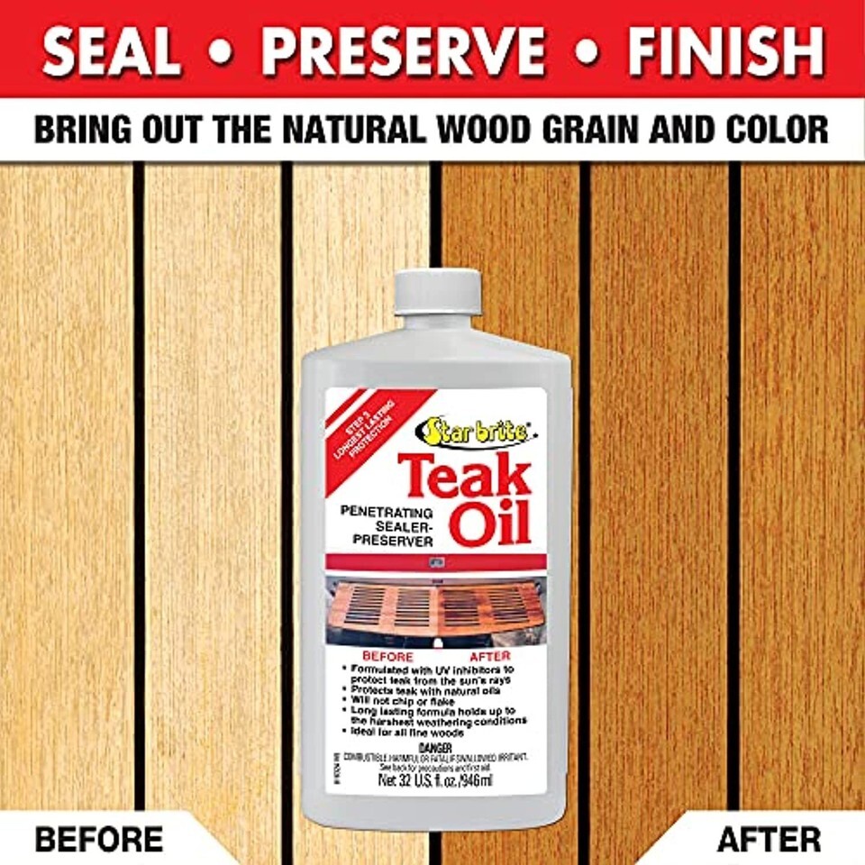 TEAK OIL is #1 rated. Deep penetrating, fast drying, longest lasting Star Brite penetrating Teak Oil is a fast drying sealer-preserver specially formulated for teak and other fine wood. Applied as directed, it will form a protective shield against the damaging effects of sun, salt, alkalis, acids and staining substances. The high quality ingredients bring out the natural wood grain and color.