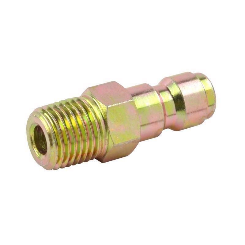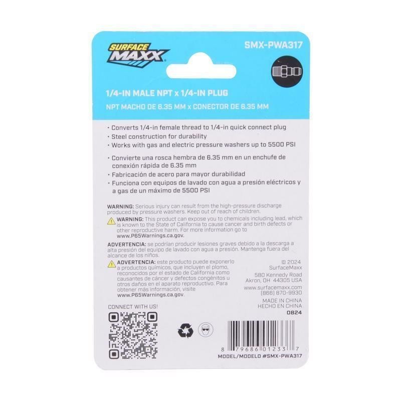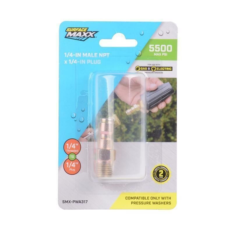 Easily connect accessories with the SurfaceMaxx 1/4-in Male NPT x 1/4-in Quick-Connect Plug. This adapter converts 1/4-in female NPT threads into a 1/4-in quick-connect plug, making it perfect for attaching 1/4-in female-threaded nozzles to pressure washer lances or wands. Built to handle up to 5500 PSI, it is suitable for both gas and electric pressure washers. Constructed from durable steel, this fitting provides superior corrosion resistance and long-lasting durability. Enhance your pressure washing system with this high-quality adapter.