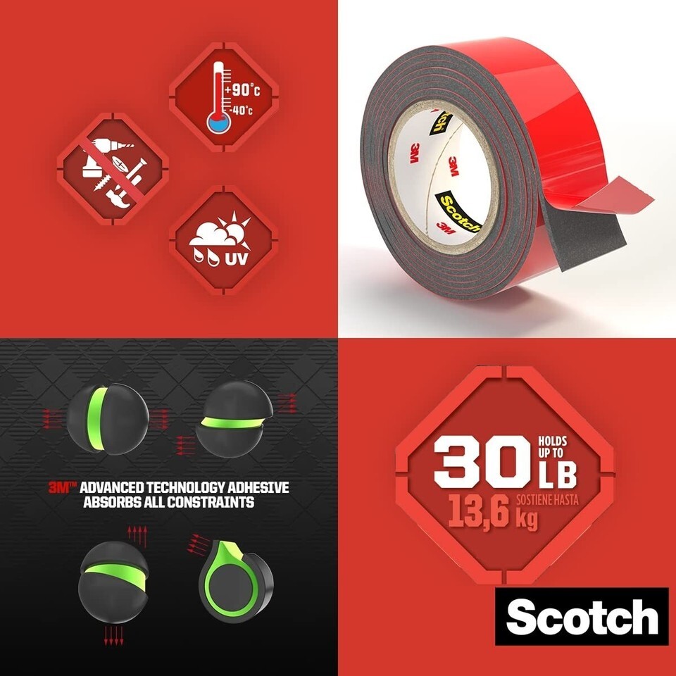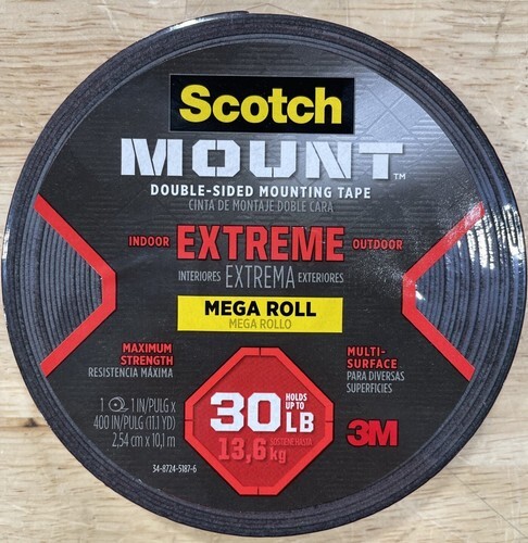 For your toughest jobs, go for our strongest hold - Scotch-Mount extreme double-sided mounting tape with its 3M industrial strength adhesive. Equipped with our powerful permanent adhesive, this double-sided tape defies gravity, holding an item up to 30 pounds. It's weather resistant for a long-lasting bond, indoors and outdoors. So, whether you're mounting shelves in your new apartment or adding wall organization to the garage, Scotch-Mount extreme double-sided mounting tape does the job quickly, easily and without the hassle of tools.