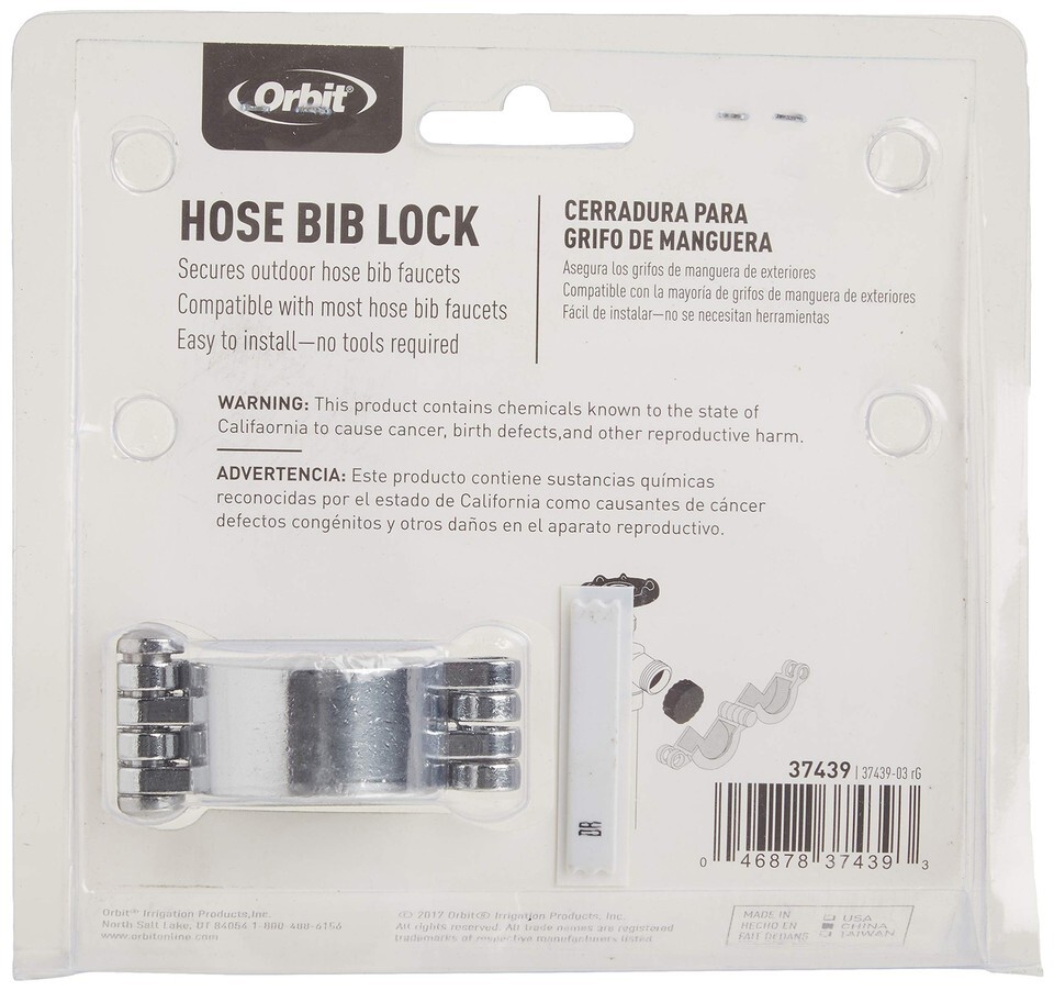 This Orbit Double-Sided Hose Bib Lock helps prevent faucet tampering. The bib lock is easy to install and fits over standard hose faucets.