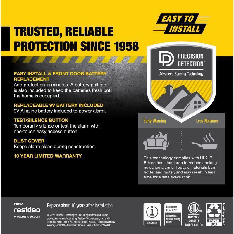 The First Alert SMI100 Battery-Operated Smoke Alarm is equipped with First Alert's Precision Detection advanced sensing technology and meets new industry standards. This battery-operated smoke alarm is easy to install and the front access battery compartment makes for easy battery replacements.