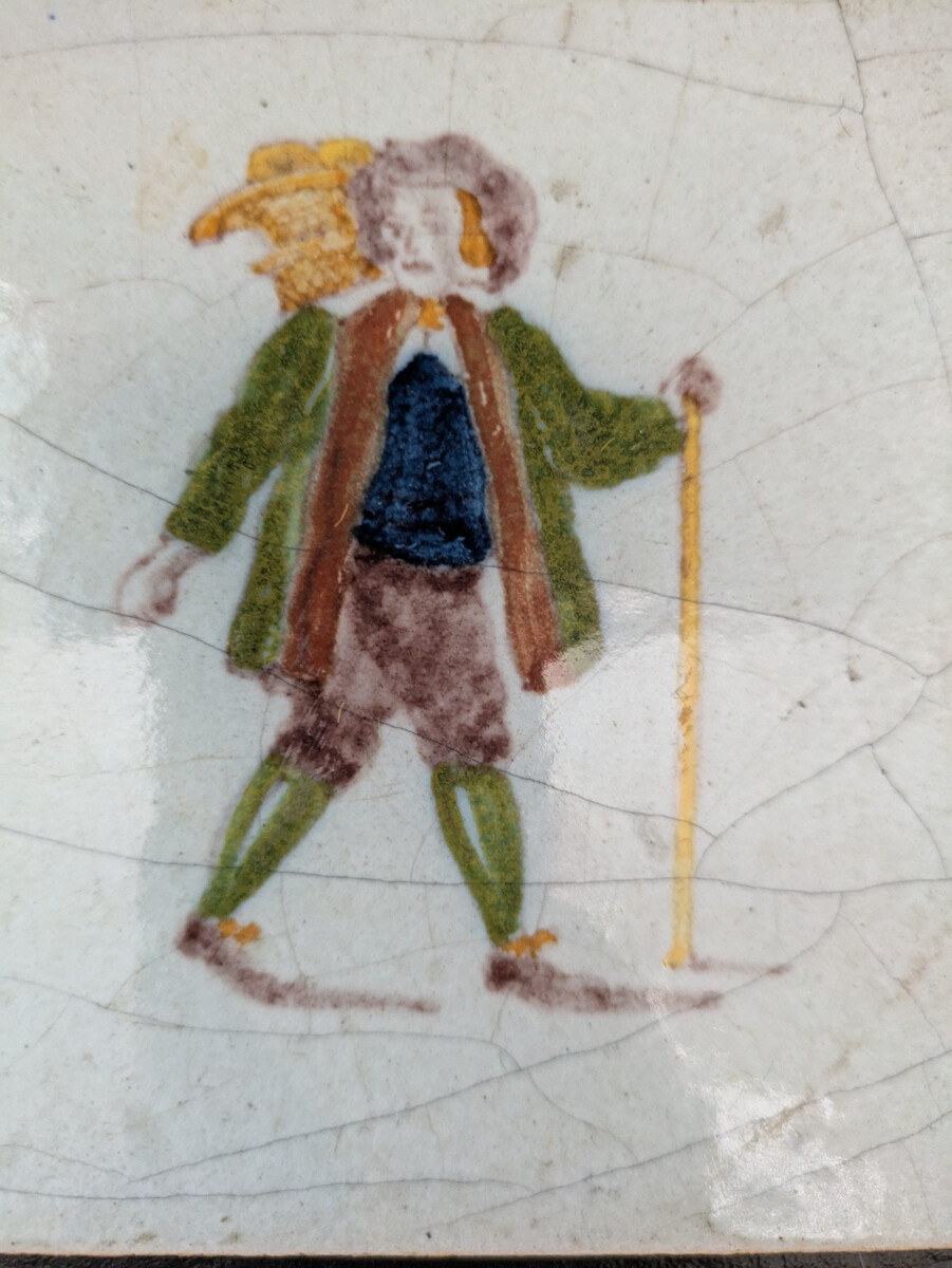 Antique Dutch Polychrome Tuiles Homme Marche Bâton Chapeau Sac à Dos Crazed