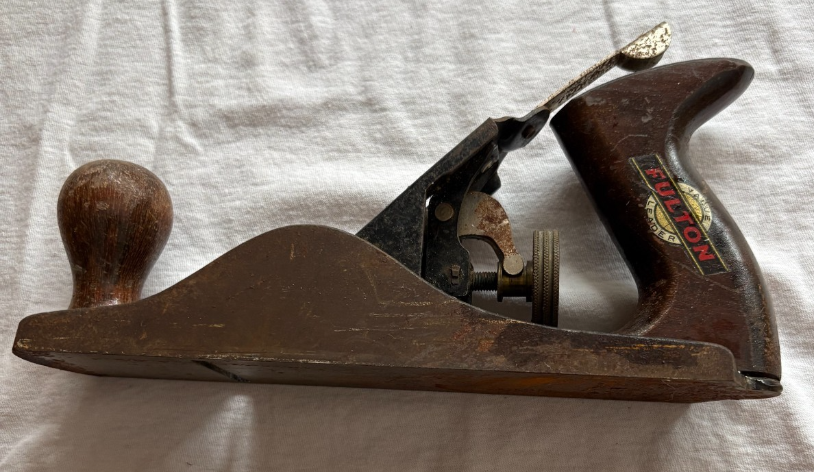 This is a vintage Fulton Bench Plane. It is a rare and classic piece of woodworking equipment made in the U.S.A. This original vintage piece from the Fulton brand is a sought-after collectible for woodworking enthusiasts and collectors alike. With its antique charm and historical significance, this bench plane adds a unique touch to any carpentry or woodworking workshop. Its vintage design and American craftsmanship make it a valuable and timeless tool for woodworking projects.