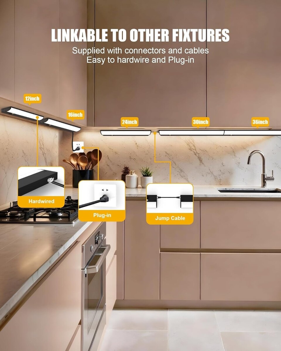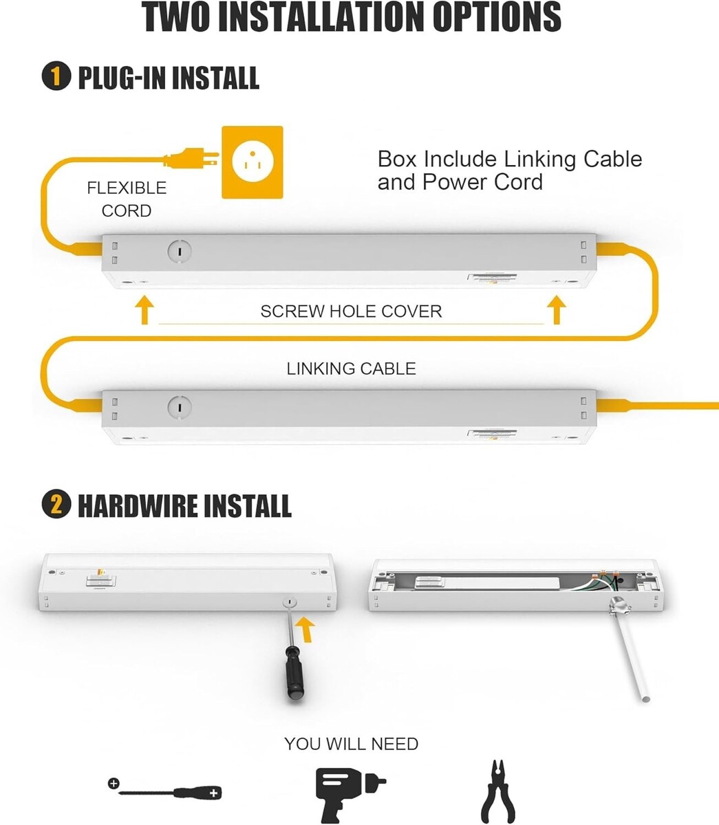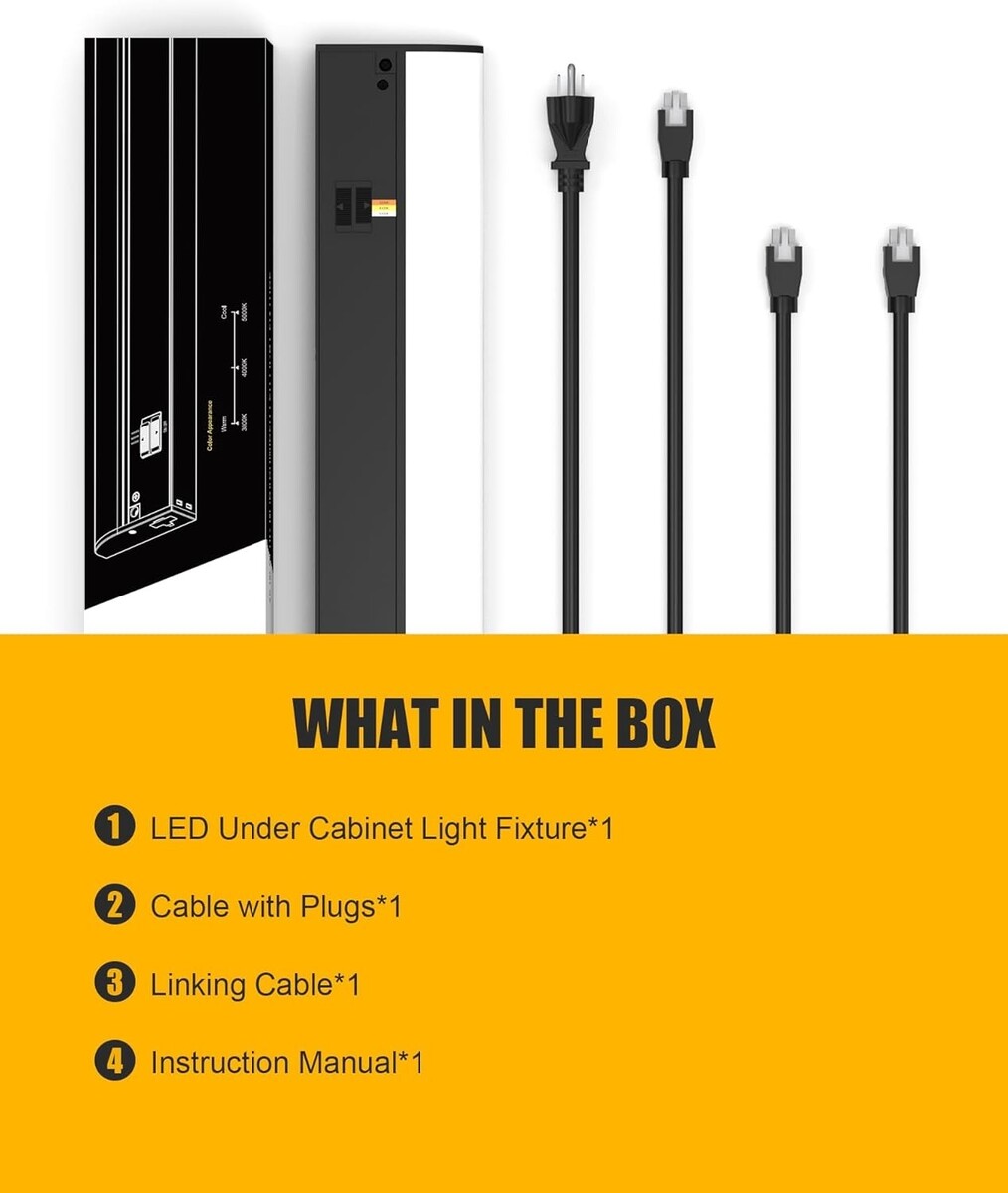 Easy to Install: Our under cabinet lights are designed for quick and hassle-free installation, requiring only a few simple steps as outlined in the instructions. We provide UL-listed push-in connectors, a standard accessory kit, and power cables for your convenience. Additionally, our lights feature multiple knockouts to enhance the hardwire installation process