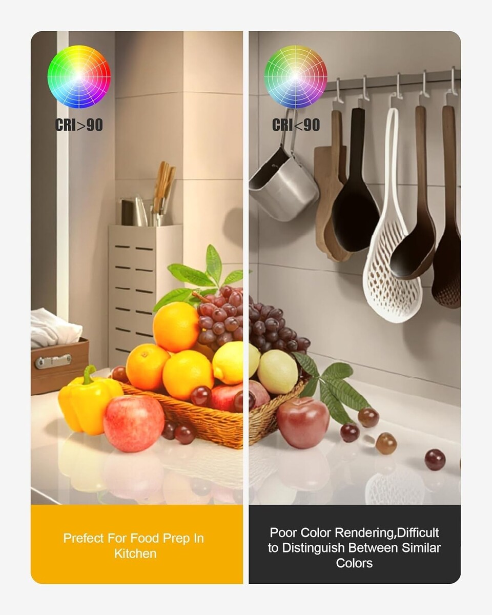 Energy Saving LED: The direct wire under-cabinet light features energy efficient, eye friendly LEDs that deliver uniform light distribution while reducing electricity costs by up to 80%. With a Color Rendering Index (CRI) of up to 97, our lights accurately restore the true colors of objects, ensuring a vibrant and natural illumination