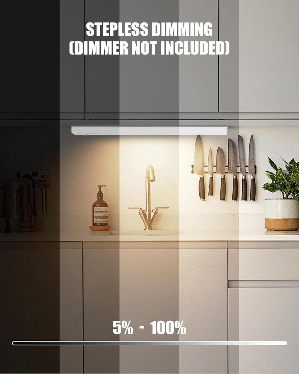 Three Color Temperatures and Seamless Dimming(Dimmer Not Included): Our linkable counter light offers three selectable color temperatures: Warm White (3000K), Cool White (4000K), and Daylight (5000K). When used with an LED dimmer, it provides smooth dimming capabilities from 10% to 100%, catering to the lighting needs of any environment