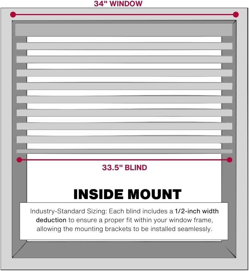 IMPORTANT SIZING INFORMATION! - This window blind is 33.5" wide to allow for mounting inside a 34" wide window opening. All inside-mount blinds include a oe-inch width deduction from the size ordered to ensure a perfect fit within your window frame. Your blind will arrive exactly 33.5" wide (for a 34" wide window). Sizes listed in the product description are measured by Width Height. Please review our measuring guide to confirm proper sizing before ordering.