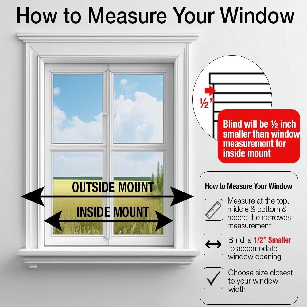 Designed for a Precise Fit: Measure window width at the top, middle, and bottom?use the narrowest size. Blinds include a oe-inch width deduction for smooth, inside-frame operation. For height, measure top to sill and choose the closest size. Suitable for inside or outside mounting.