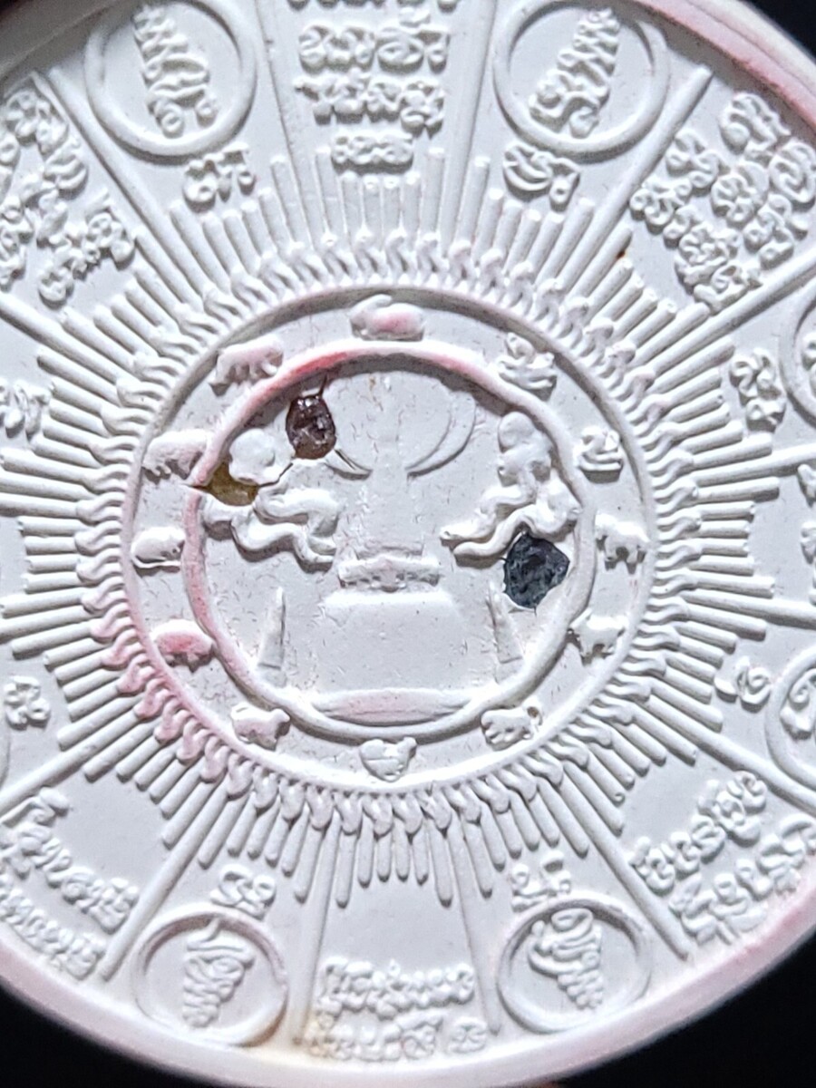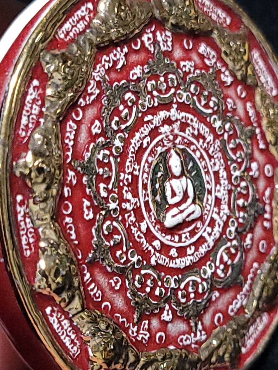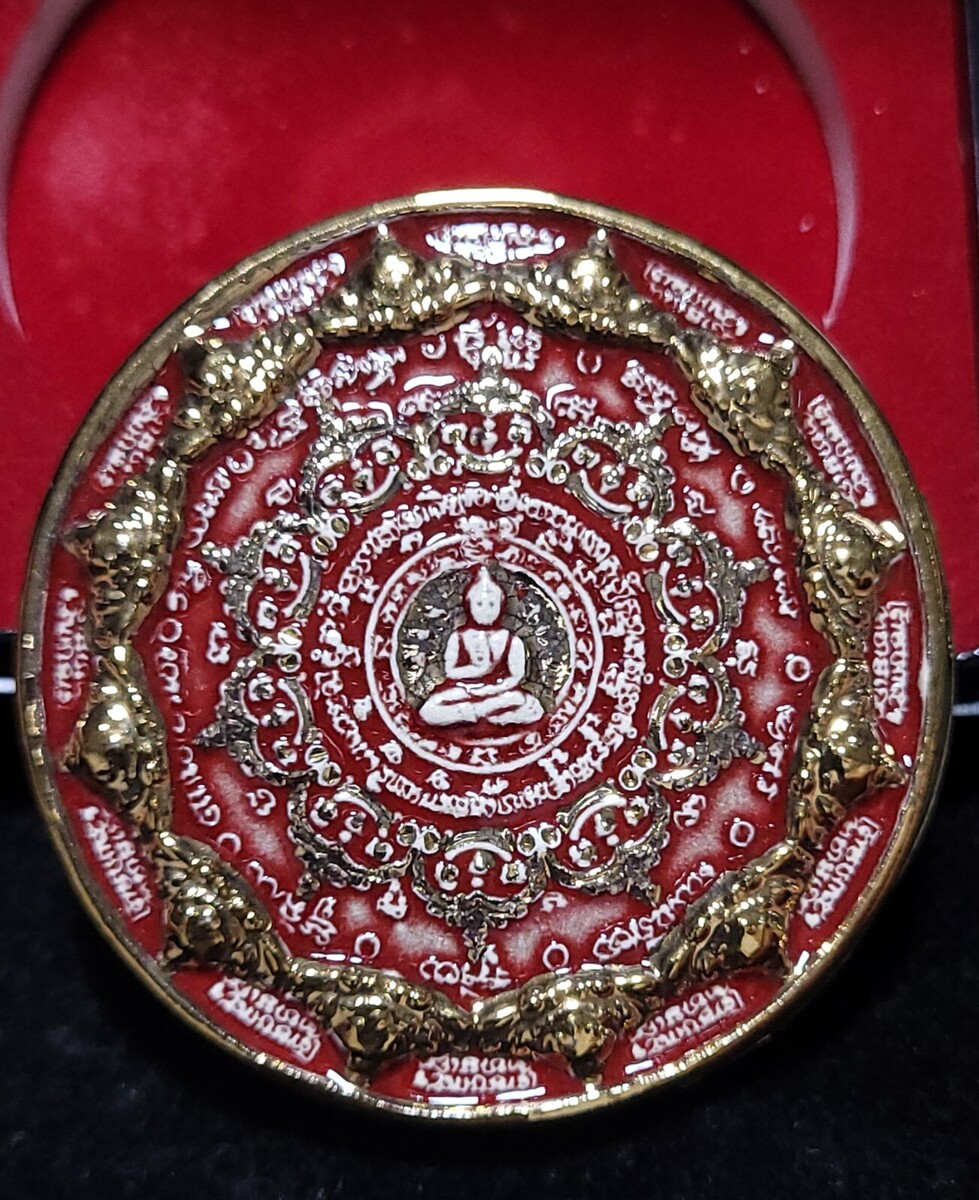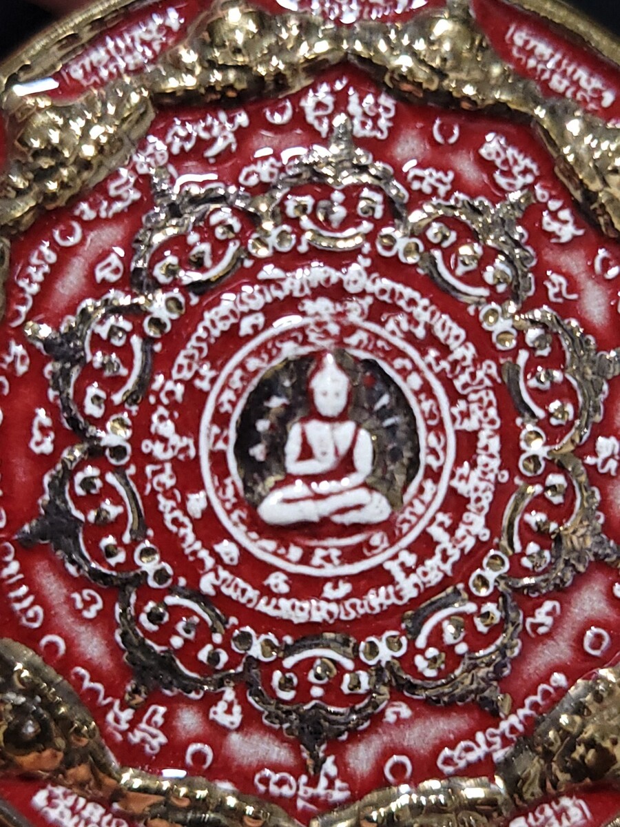 The product is a rare and real Thai amulet called Phra Jatukam Ramathap "Chantaraphanu Maharat" originating from Thailand. Made from mixed materials, this original amulet was crafted by the maker Wat Pramahatat around 18 years ago. The amulet's intricate design and vibrant colors make it a valuable and unique piece for collectors of Southeast Asian antiques.