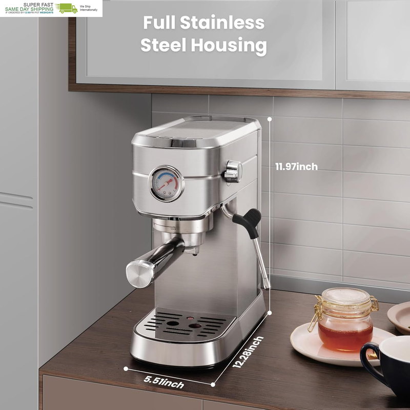 Commercial Espresso and Coffee Makers, Professional 20 Bar Espresso Maker with Milk Frother, Stainless Steel Expresso Coffee Machines for Home, Compact Cappuccino Machine, Great Gift