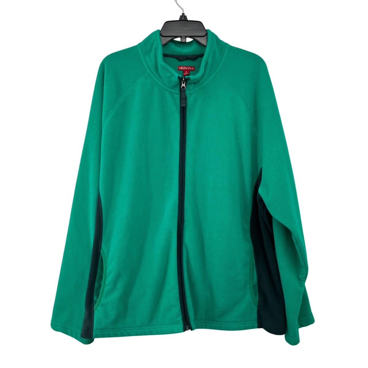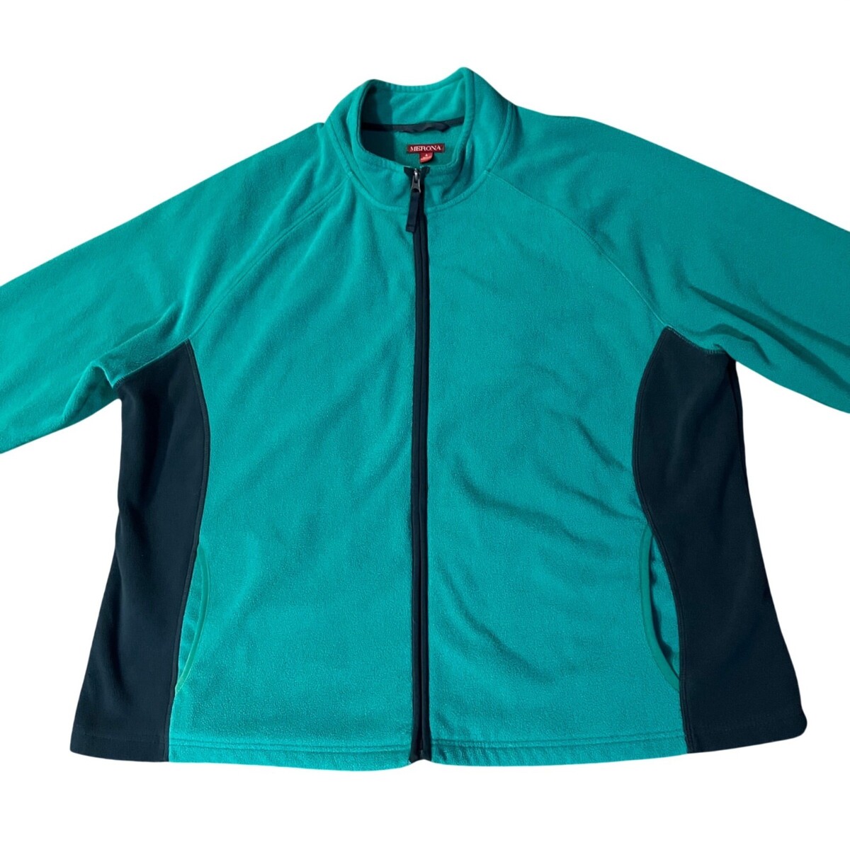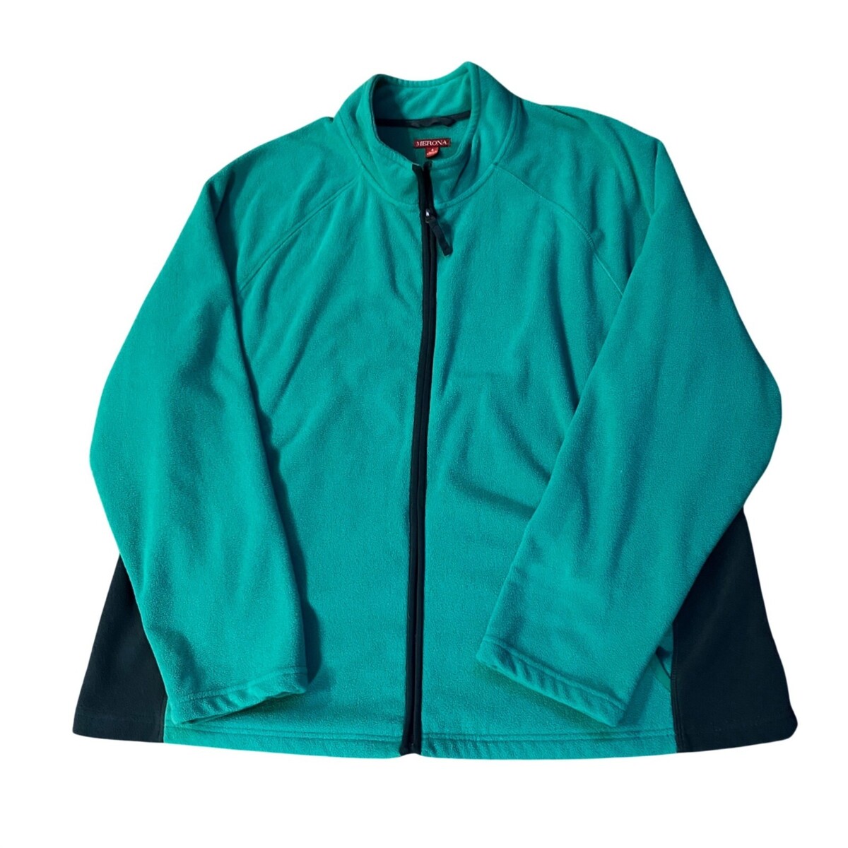 Cozy Merona fleece jacket in attractive teal green and black colorblock design. Perfect for layering during fall and winter seasons. Full zip front closure with hand pockets for convenience.