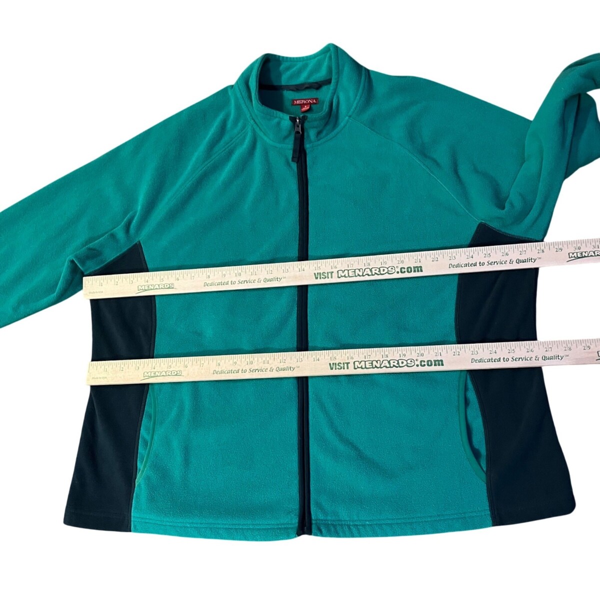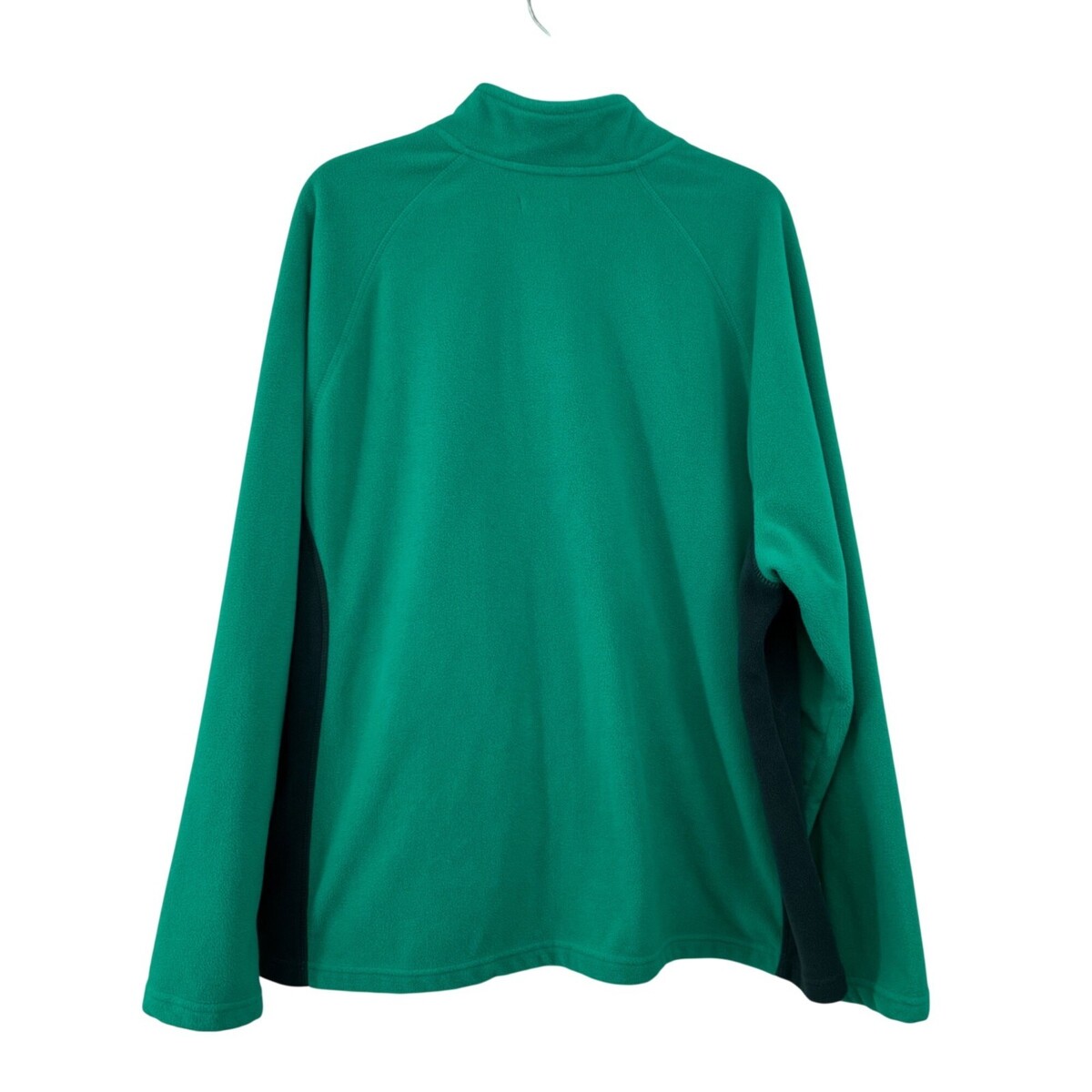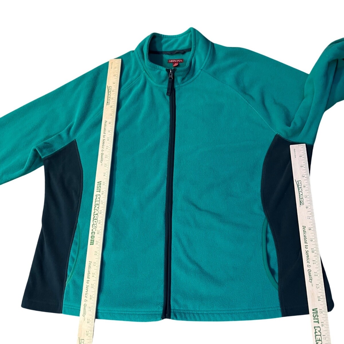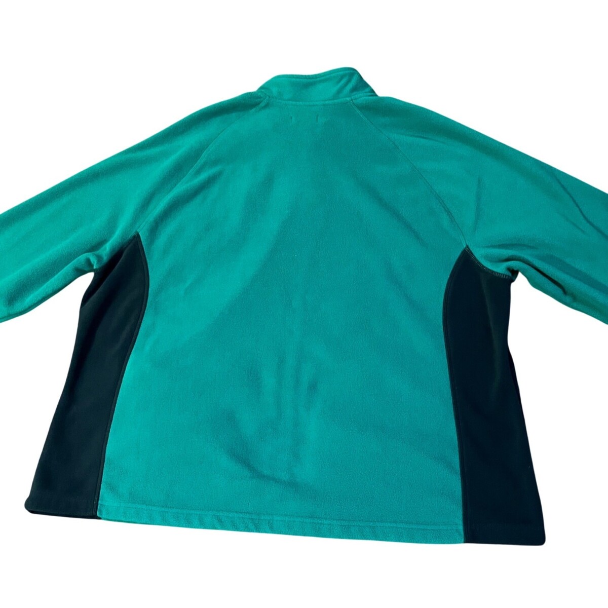 Cozy Merona fleece jacket in attractive teal green and black colorblock design. Perfect for layering during fall and winter seasons. Full zip front closure with hand pockets for convenience.