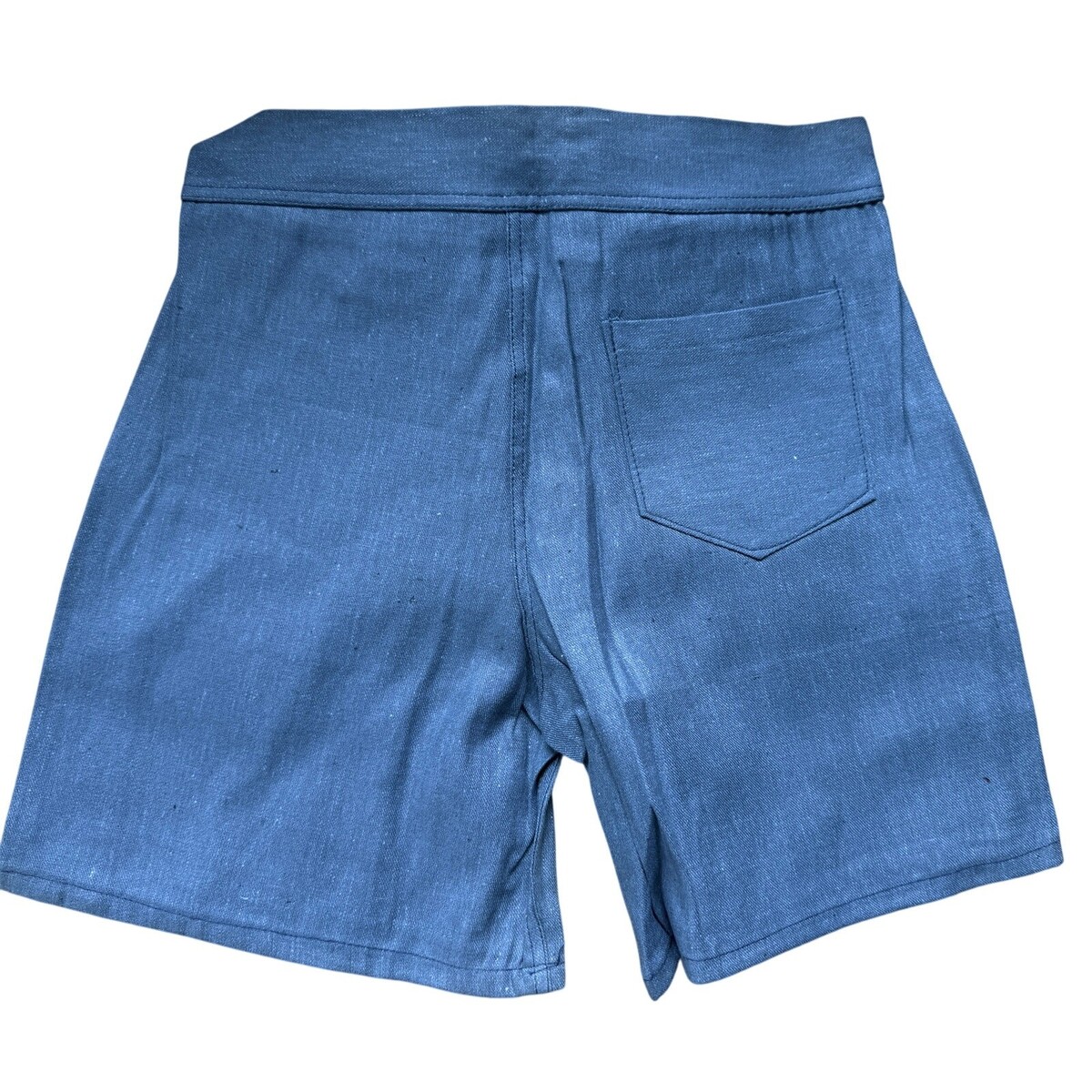 These blue, high-rise shorts, a size 8, feature a classic 3-button fly and a unique Art Deco buckle on the attached self-belt. They are made from sanforized cotton that has a feel and look very similar to denim, a testament to the durable materials of the era. The shorts are designed with cool, period-specific topstitching that highlights their quality craftsmanship.