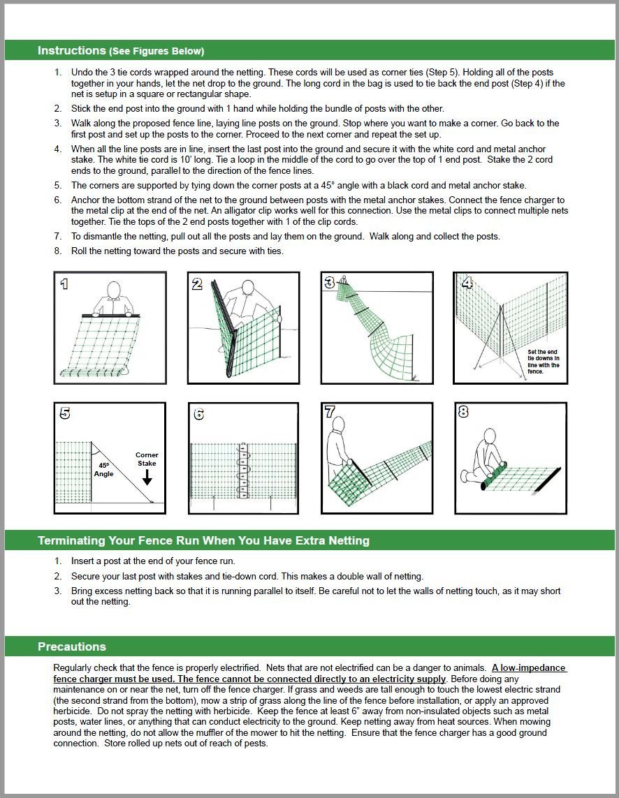 Product description: Pow erfields Poultry and Goat Netting Keep predators out and your livestock safe by using this poultry and goat netting. Horizontal strands are spaced close at the bottom and gradually increase spacing towards the top; similar to a metal combo panel. This aids in containing clipped fowl and smaller animals yet is tall enough for goats, llamas, and even horses or cows. The vertical and horizontal strands are connected by a molded plastic nonslip bead. The vertical and bottom horizontal stands are wireless to prevent arching to the ground. All horizontal strands are connected at both ends with a stainless steel junction clip for joining additional nets and connecting the fence charger. Item Specifications: Model # P-89 Roll measures 40" tall x 164' long Contains animals including poultry, goats, large dogs and llamas Also helps protect animals from predators Use a Fence charger with a minimum of .25 low impedance joules of power per net. Additional power will provide a more memorable experience for the would-be predator. Always keep fence electrified if erected. Made in the USA Item Components: 12 horizontal strands with 15 line posts 2 tie-down cords Repair kit