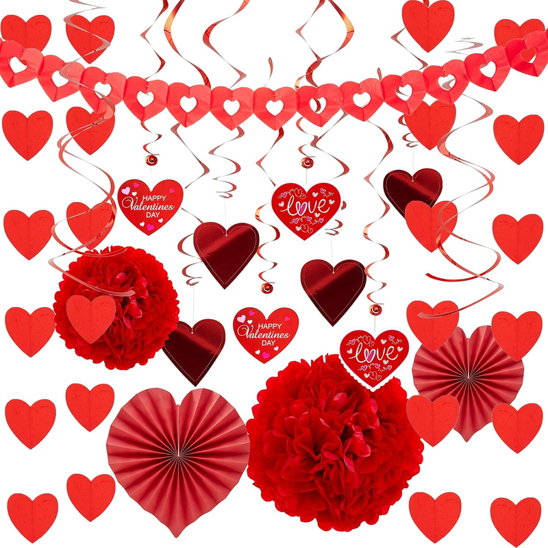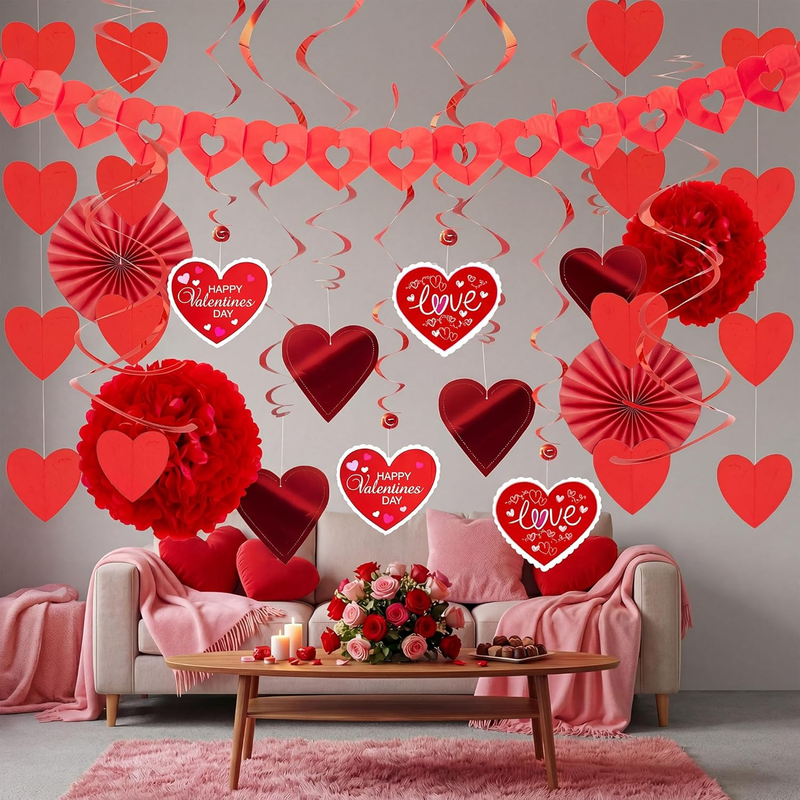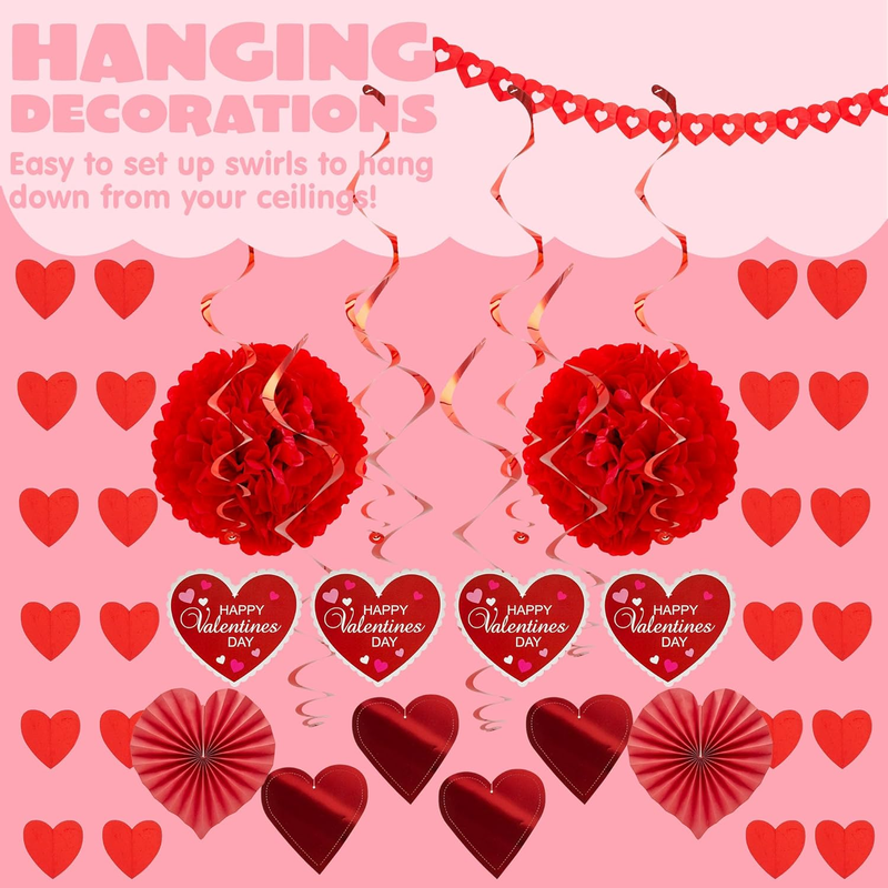 SUPER VALUE with Valentine?s Day Decorations Kit with 1 Heart Shaped Garland, 2 Tissue Fans, 2 Tissue Poms, 6 Foil Strings, 8 Double Swirls and 4 Foil Cutouts Swirls and 4 Cardstock Cutouts Swirls.
