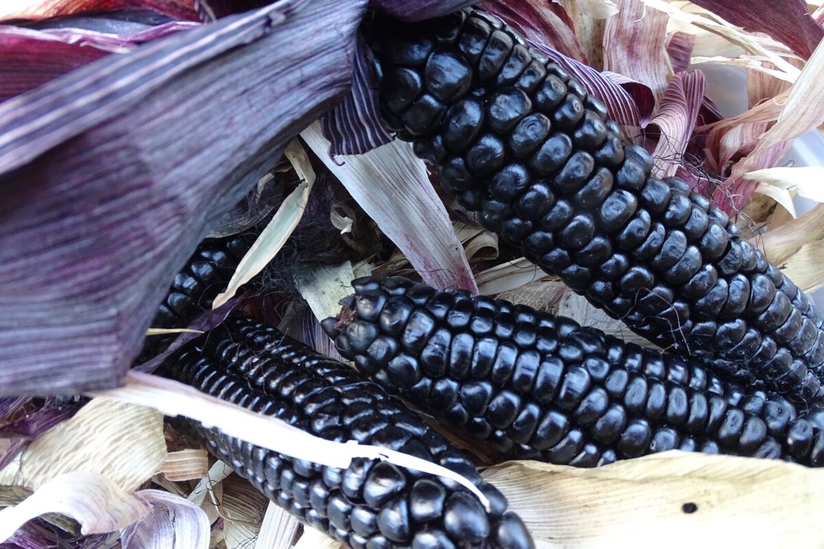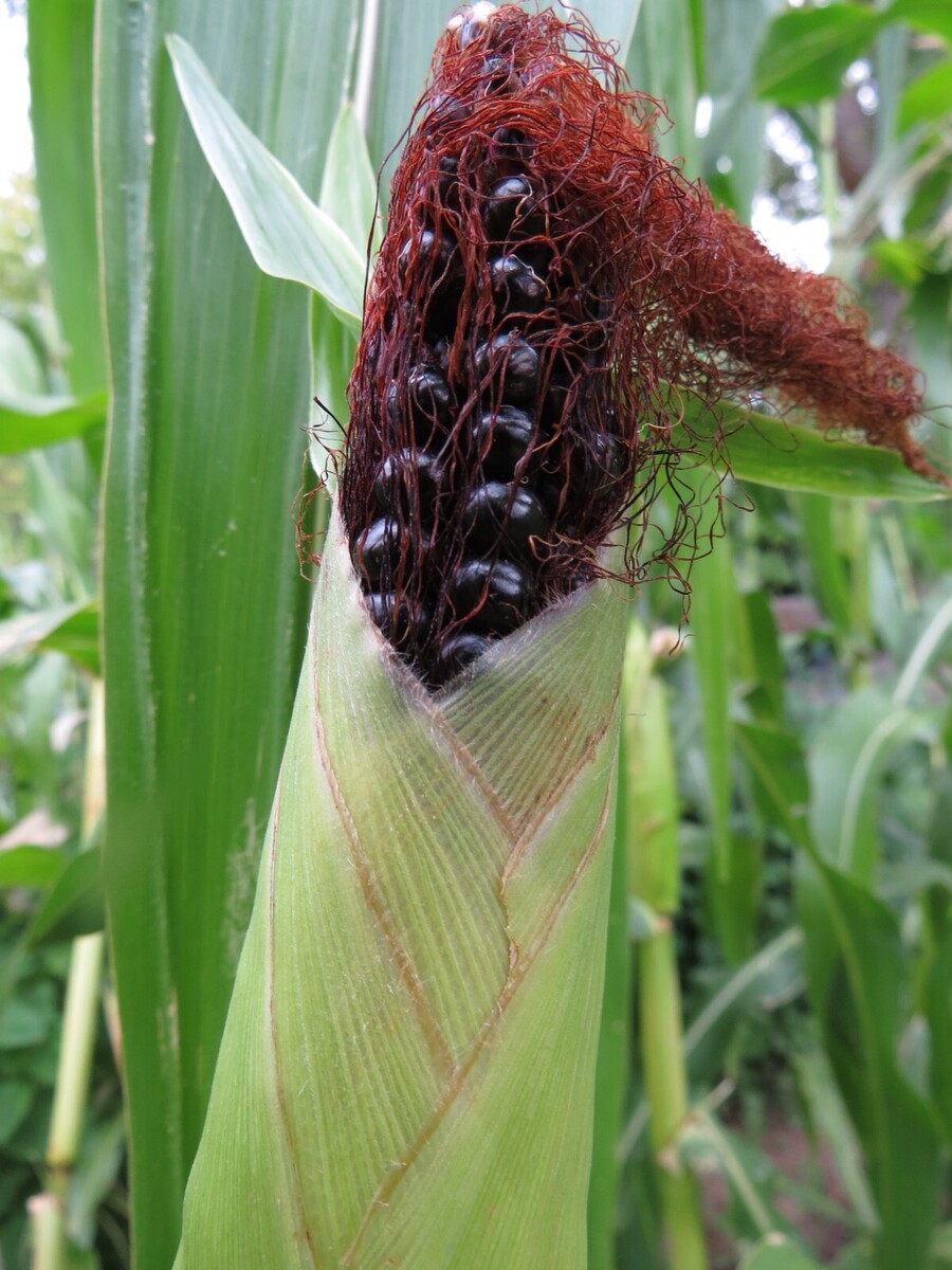 Maiz Morado was cultivated in the Peruvian Andes in ancient times and was a staple of the fabled Incan Empire. The large, deep, purple-black kernels form on slender pupple cobs as you see in one of the photos. The color is so intense, it can stain your hands. Sweet, ripe Maiz Morado is the main ingredient in Chichi Morada, Peru?s national drink. I've made it, and it is pretty good. Like all fruits and vegetables with purple coloring, the corn is high in anthocyanins, a powerful anti-oxidant. You can also dry and grind the corn for dark blue corn meal or eat it like sweet corn at the milk stage - though I haven't tried that.The stalks are giant - reaching 8-10 foot and each bears two 8 inch or longer ears, many with bright purple husks. This corn matures later in the season. You need about 100 days. It does fine here, though, on the edge of zones 5 and 6. 80 seeds per packet