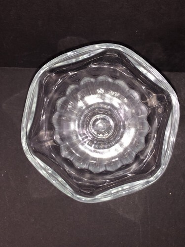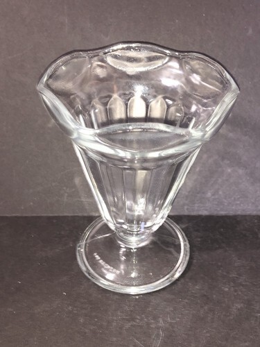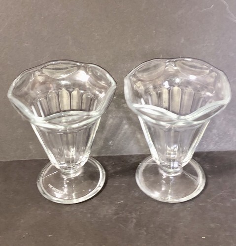 The VTG KIG Parfait Tulip Glasses are a set of 2 vintage ice cream sundae pedestal fluted bowl glasses from the 1950s. These clear glass bowls feature a paneled side pattern, round shape, and decorative mid-century modern style. Made in the United States with pressed glass production technique, these original parfait ice cream sundae glasses stand at 5 inches tall with a 4-inch diameter. The glossy finish and impressed backstamp add to the charm and nostalgia of these collectible pieces perfect for adding a touch of retro flair to any dining set.
