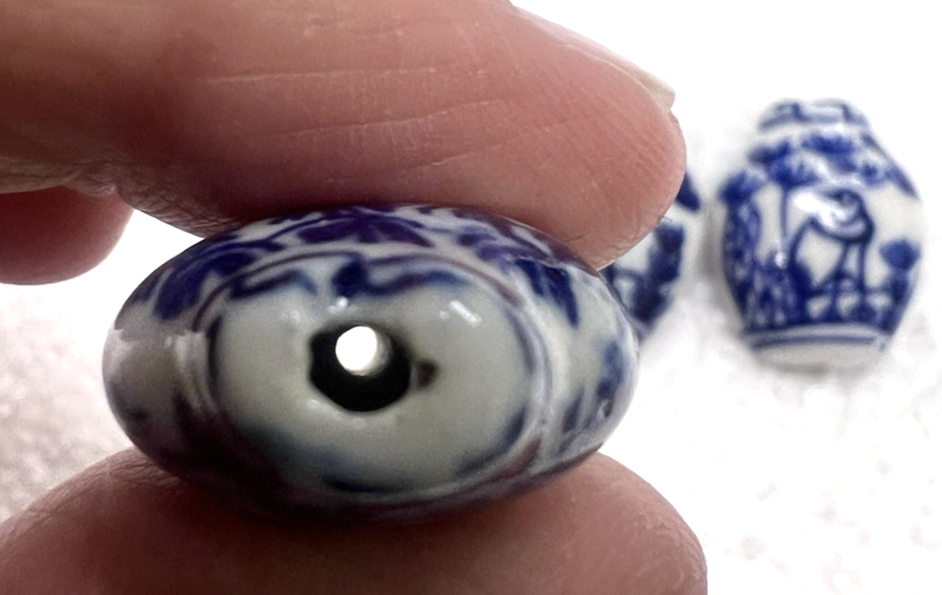 3 Older Blue White Porcelain Vase Shaped Beads w Bird Floral Design 7/8L 3/4W 3/8 Thick