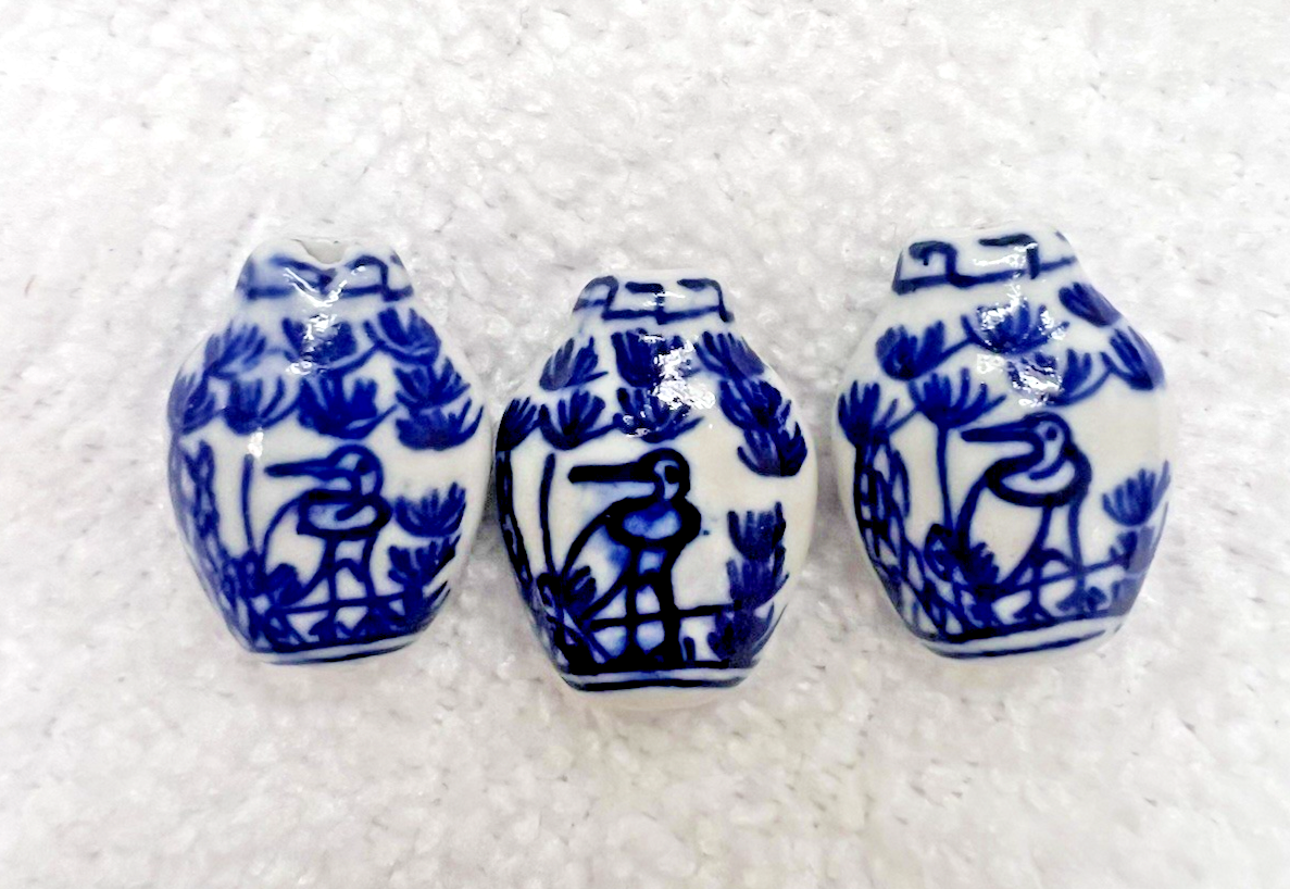3 Older Blue White Porcelain Vase Shaped Beads w Bird & Floral Design 7/8L 3/4W