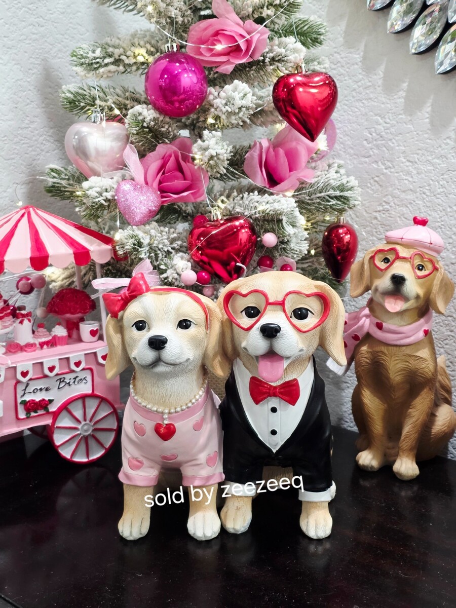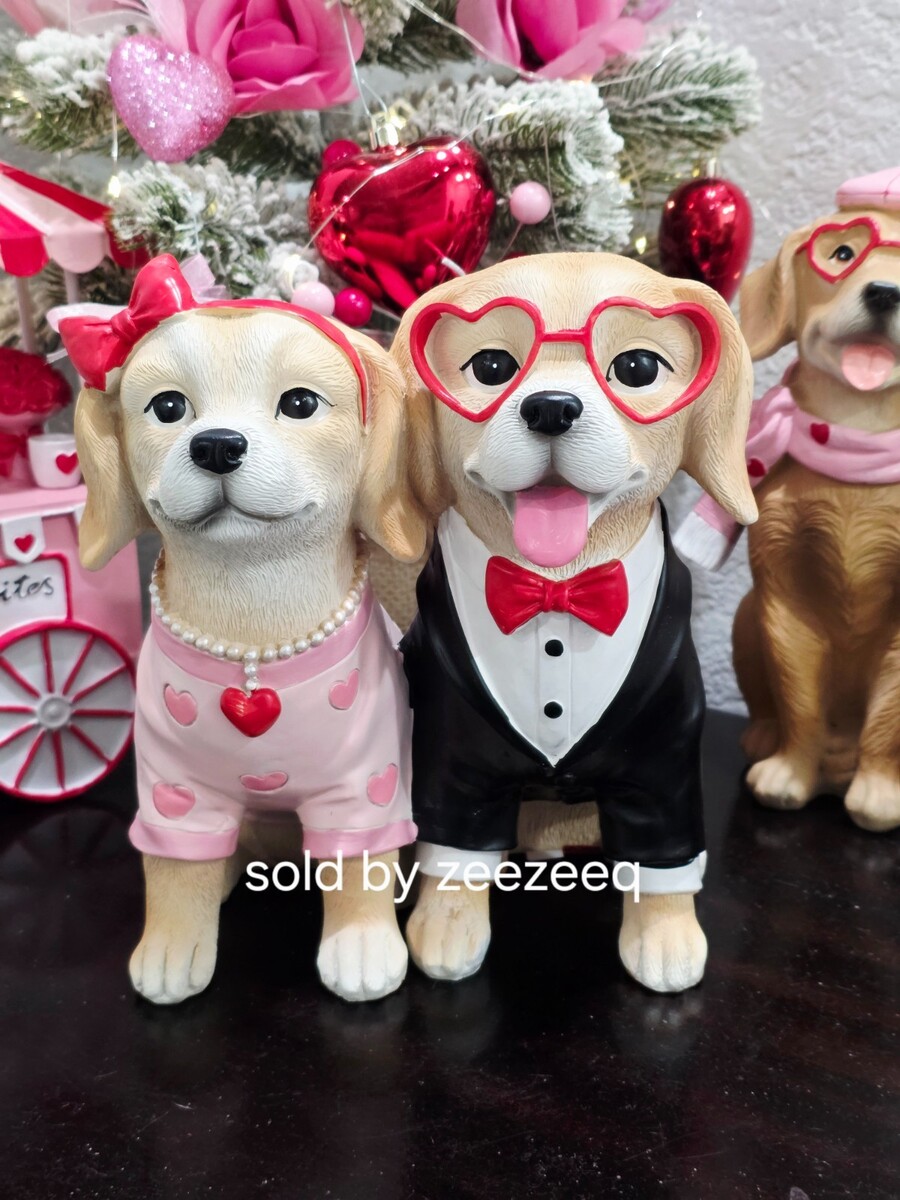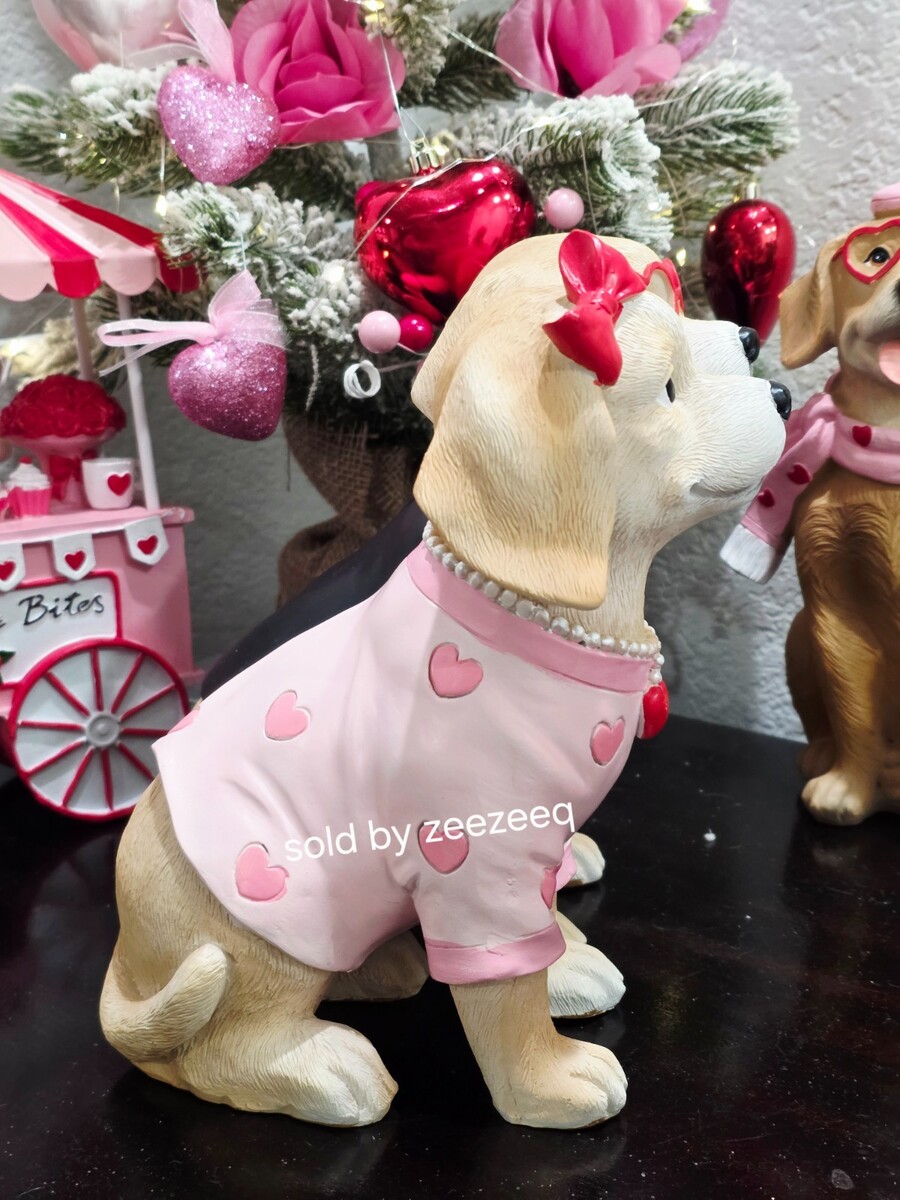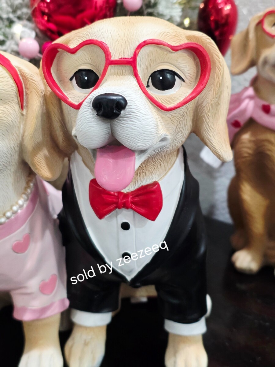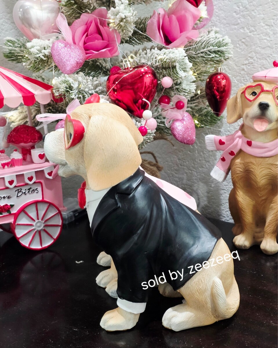 Up for sale we have this adorable Labrador couple for your Valentine's Day decor. This piece is sooo cute and will look amazing with your decor. She is wearing pink with a faux pear necklace with a red heart and he is wearing a black tuxedo with red heart shaped glasses. too cute! Made of resin it measures approx 8.5" tall x 7.5" wide. NEW.