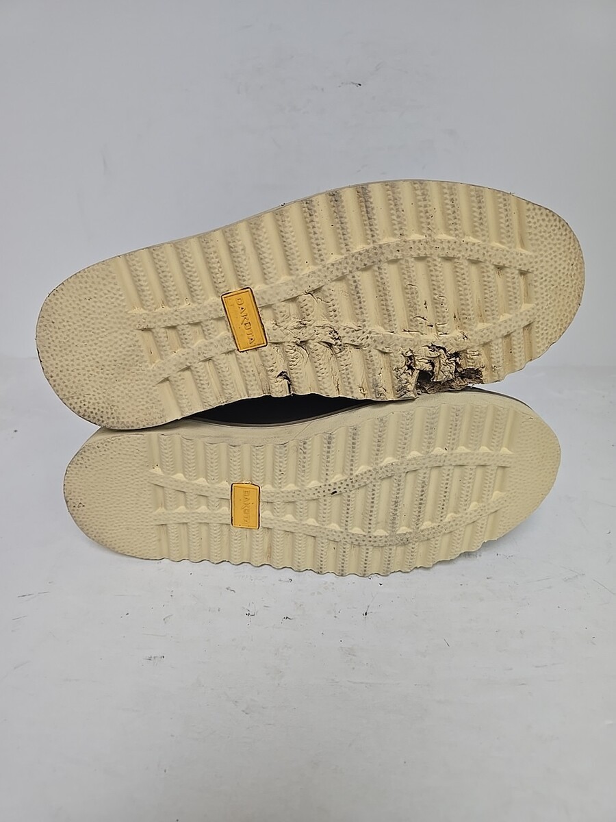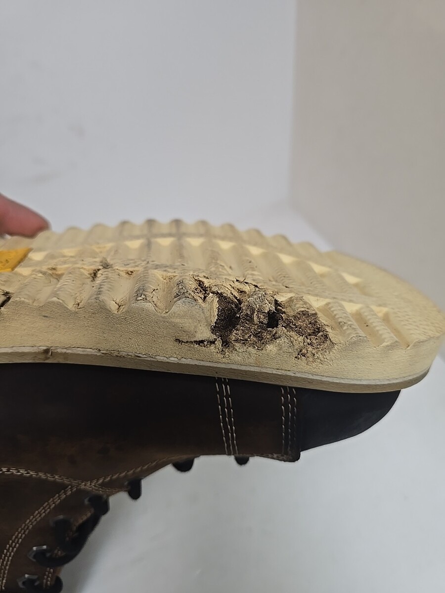 RIGHT BOOT HAS A CHUCK OF RUBBER MISSING, BOOTS ARE STILL WEARABLE AND HAVE PLENTY OF LIFE LET IN THEM.