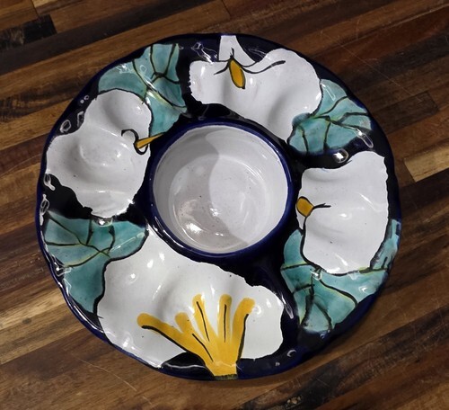 This vibrant red clay plate is a beautiful piece of Mexican folk art. Handmade by the Tonal brand, it features a unique design that tells a story. The plate is a collectible item that would make a great addition to any home decor. It has been well-maintained and is free from any damage.