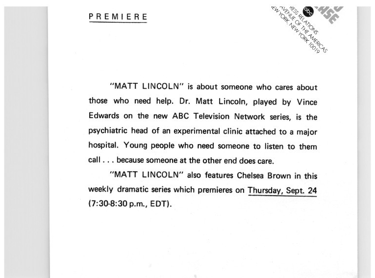 Vince Edwards Matt Lincoln Chelsea Brown Press Photo Sketch Jim Sharpe ABC 1970