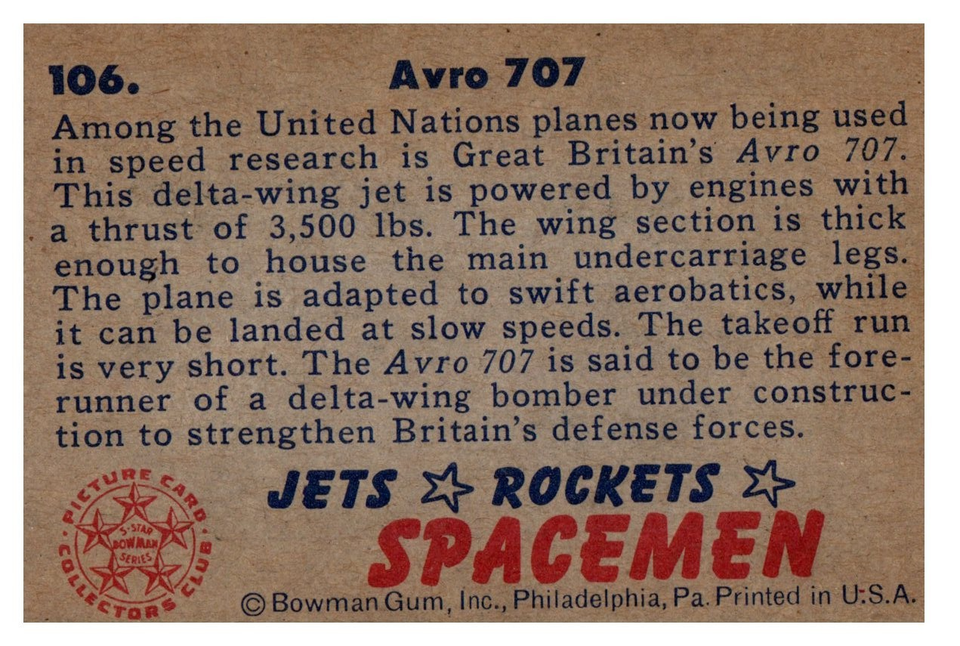 Jets, Rockets, Spacemen Bowman Gum #106 1951 EX/VG+ Avro 707 Vintage Modern Jets