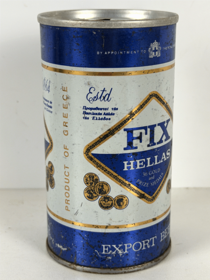 This vintage original FIX Hellas beer can showcases a classic design from the renowned Greek brewery, established in 1864. Crafted from steel, this collectible can features a striking blue and white color scheme accented with gold detailing. The front highlights the FIX Hellas logo within a diamond-shaped emblem, surrounded by intricate gold prize medal motifs, emphasizing the brand's prestigious history and quality.