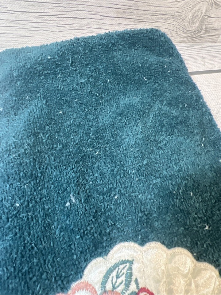 The set is from the 1980s and was manufactured in the United States. Each towel is embroidered and textured, adding a unique touch to your bathroom decor. This towel set is perfect for any room or bathroom and is sure to impress your guests.