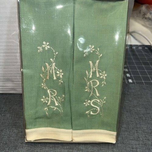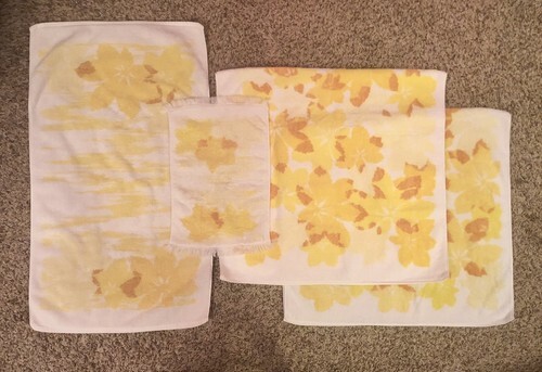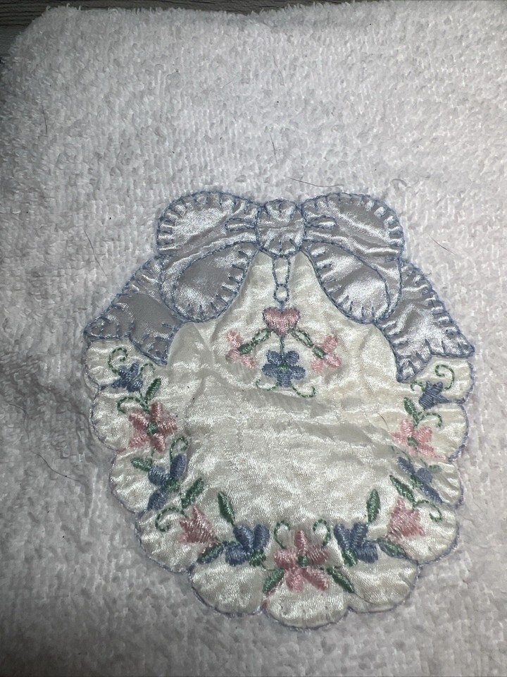 The set is from the 1980s and was manufactured in the United States. Each towel is embroidered and textured, adding a unique touch to your bathroom decor. This towel set is perfect for any room or bathroom and is sure to impress your guests.