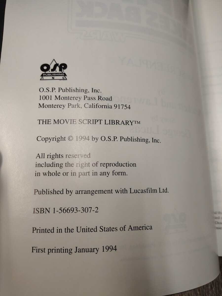 This is a rare 1994 Collector's Edition of the original screenplay for Star Wars: Episode V - The Empire Strikes Back. Published by O.S.P. Publishing in arrangement with Lucasfilm Ltd., this edition was released as part of the prestigious "Movie Script Library" in collaboration with Premiere Magazine.