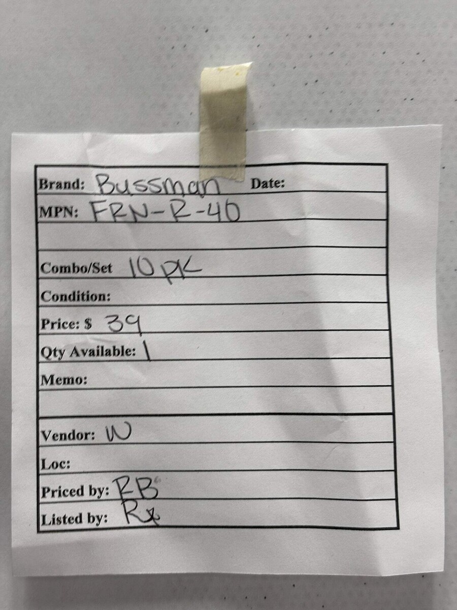 10 Pk Bussman FRN-R-40 Class RK5 40 Amp Time-Delay Fuse for Protection New The Bussman FRN-R-40 is a Class RK5 time-delay fuse designed to provide dependable overcurrent protection for industrial and commercial electrical systems. Rated at 40 amps with a maximum voltage of 250VAC or 125VDC, it is commonly used in motor circuits, transformers, and power distribution equipment. Its dual-element construction allows the fuse to tolerate temporary inrush currents while still responding quickly to sustained overloads and short circuits. The fuse offers a high interrupting rating of up to 200 kA, ensuring safe operation even during severe fault conditions. Listed by: Richard (Sales Team) ?Courage catching up with our passion equals goals attained? RRW (A positive moment brought to you by Help Resale) About Us Welcome to Help Resale, your go-to consignment shop where value meets quality. At Help Resale, we're dedicated to providing you with an exceptional shopping experience, whether you're looking to find the best deals or consign your items. Need to buy a product, but don't see it in our store? Please feel free to reach out to us and we will help you find it! Help Resale 7200 Fair Oaks Blvd Suite 120 Carmichael CA 95608 Business Hours: Monday-Friday: 9:00 am to 5:00 pm (PST) All product and company names are trademarks TM or registered trademarks of their respective holders. Use of them does not imply any affiliation with or endorsement by them.