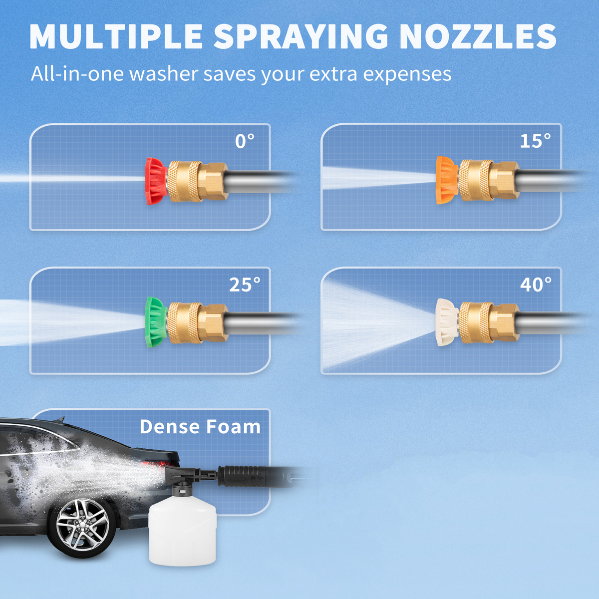 Extended Hose Leak-proof: A 20 ft hose allows for flexible cleaning in any large area. Our high-pressure washer adopts a sturdy metal water inlet and outlet to avoid water leakage, so you no longer have to worry about water spraying everywhere. Get ready to get every job started right.