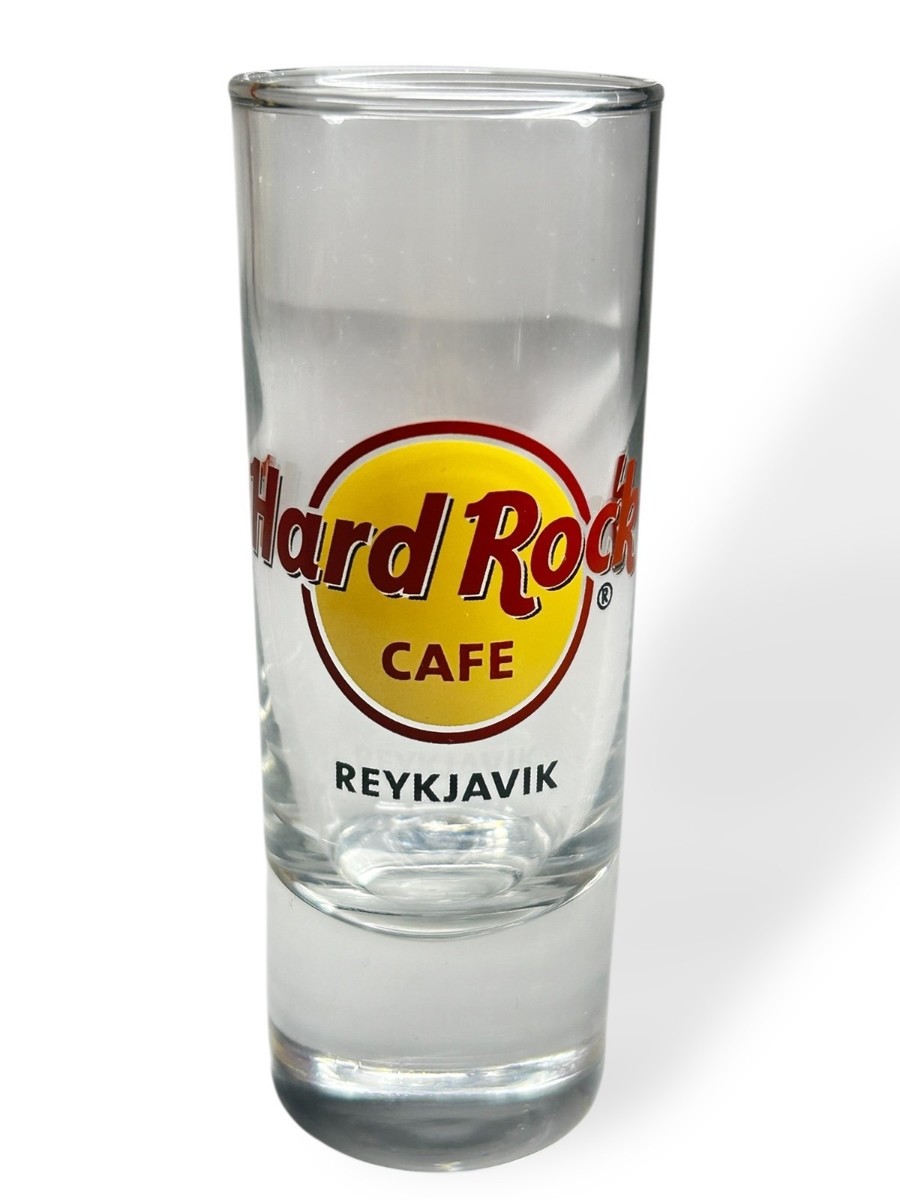 Hard Rock Cafe Reykjavik Collector Shot Glass 4" Tall Clear Souvenir Barware
