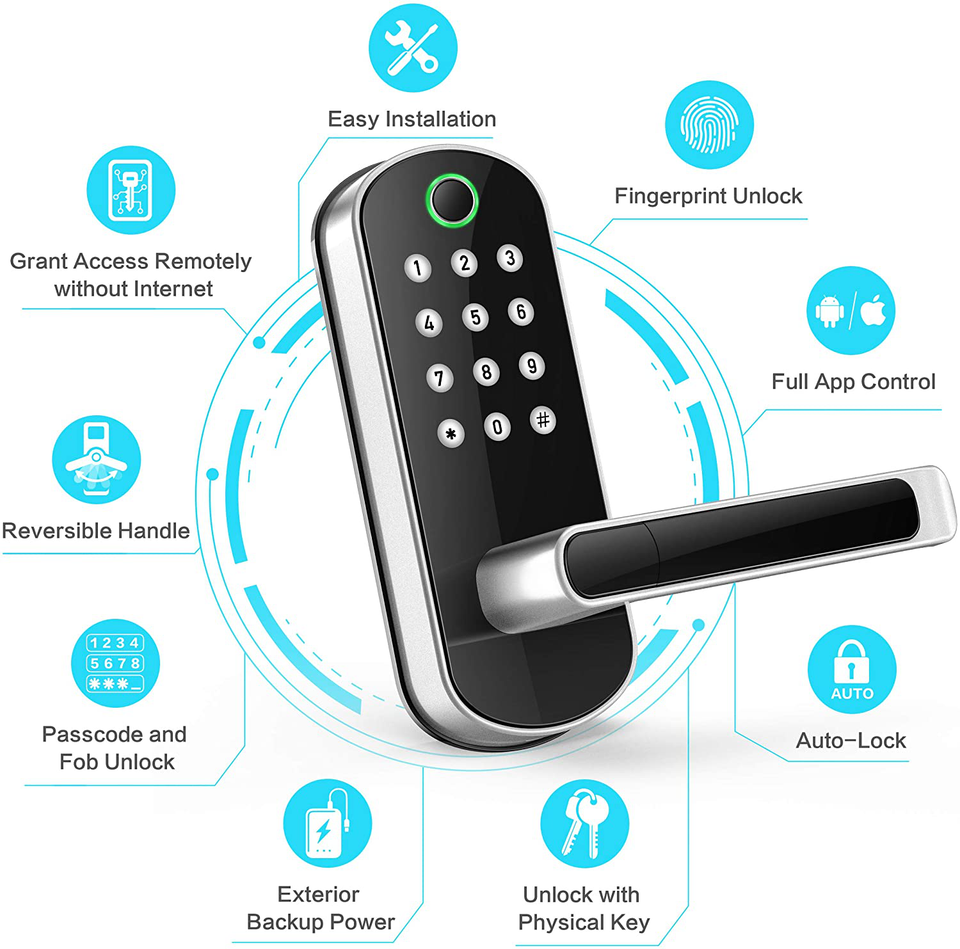 ??Advanced 3D Fingerprint?Unlock the door less than 0.3 seconds with our 3rd generation fingerprint access technology. The most secured 5-in-1 Keyless Entry Smart Door Lock: Fingerprint + Passcode + Fob + Smartphone + Key.